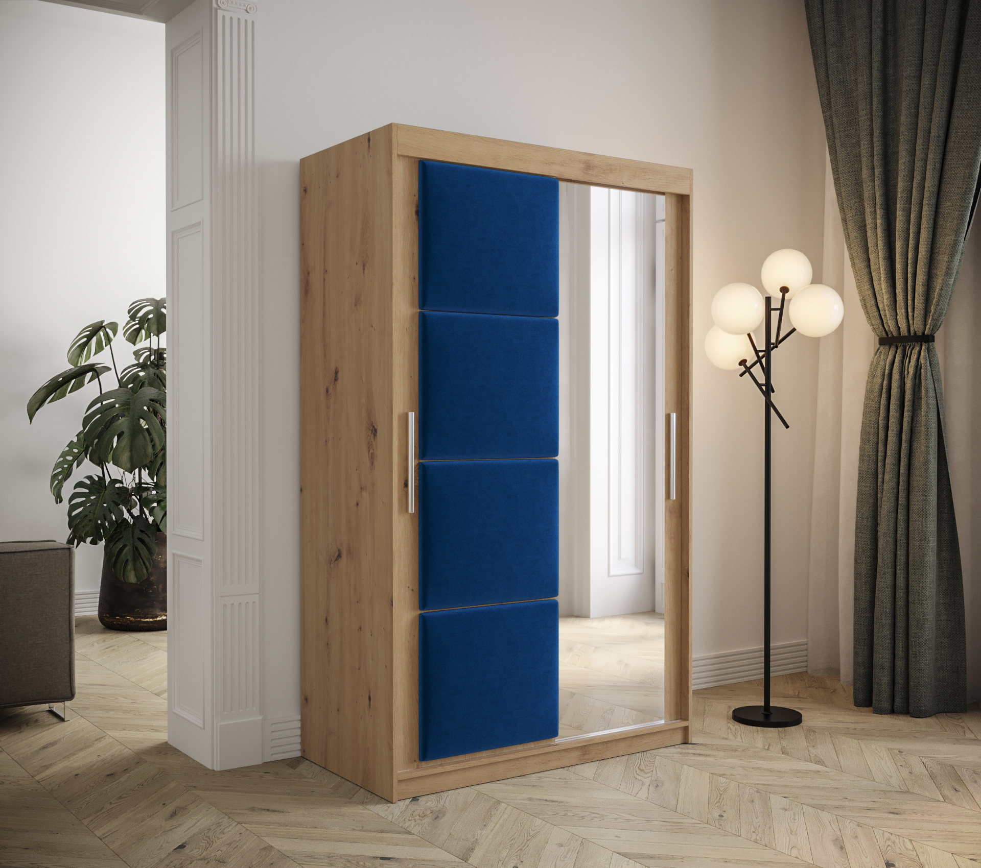 - Ozdobné čalouněné panely: Posuvné dveře jsou zdobeny čalouněnými panely, které dodávají skříni elegantní vzhled.