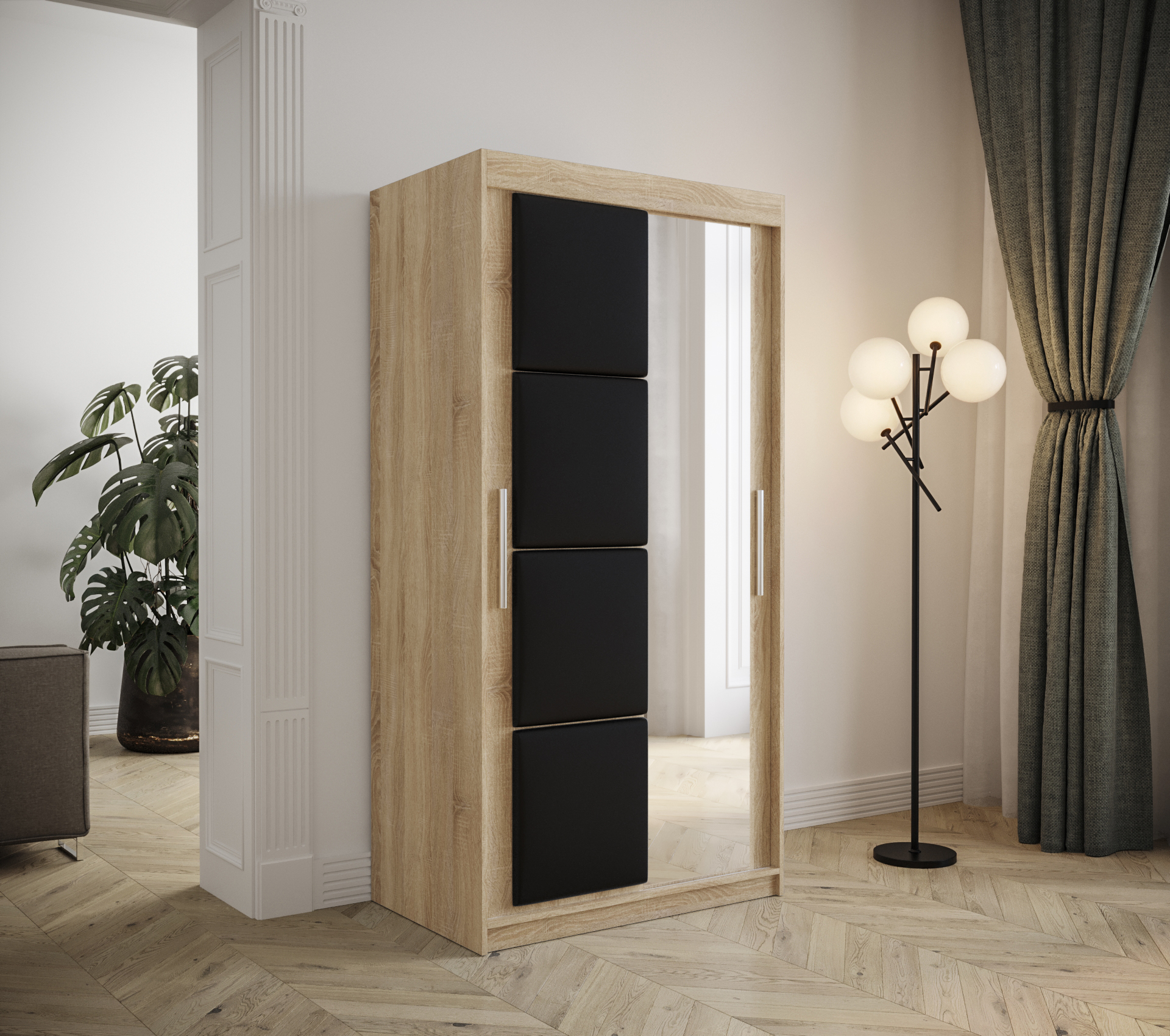 - Ozdobné čalounění: Posuvné dveře jsou zdobeny čalouněnými panely, které dodávají skříni jedinečný vzhled.