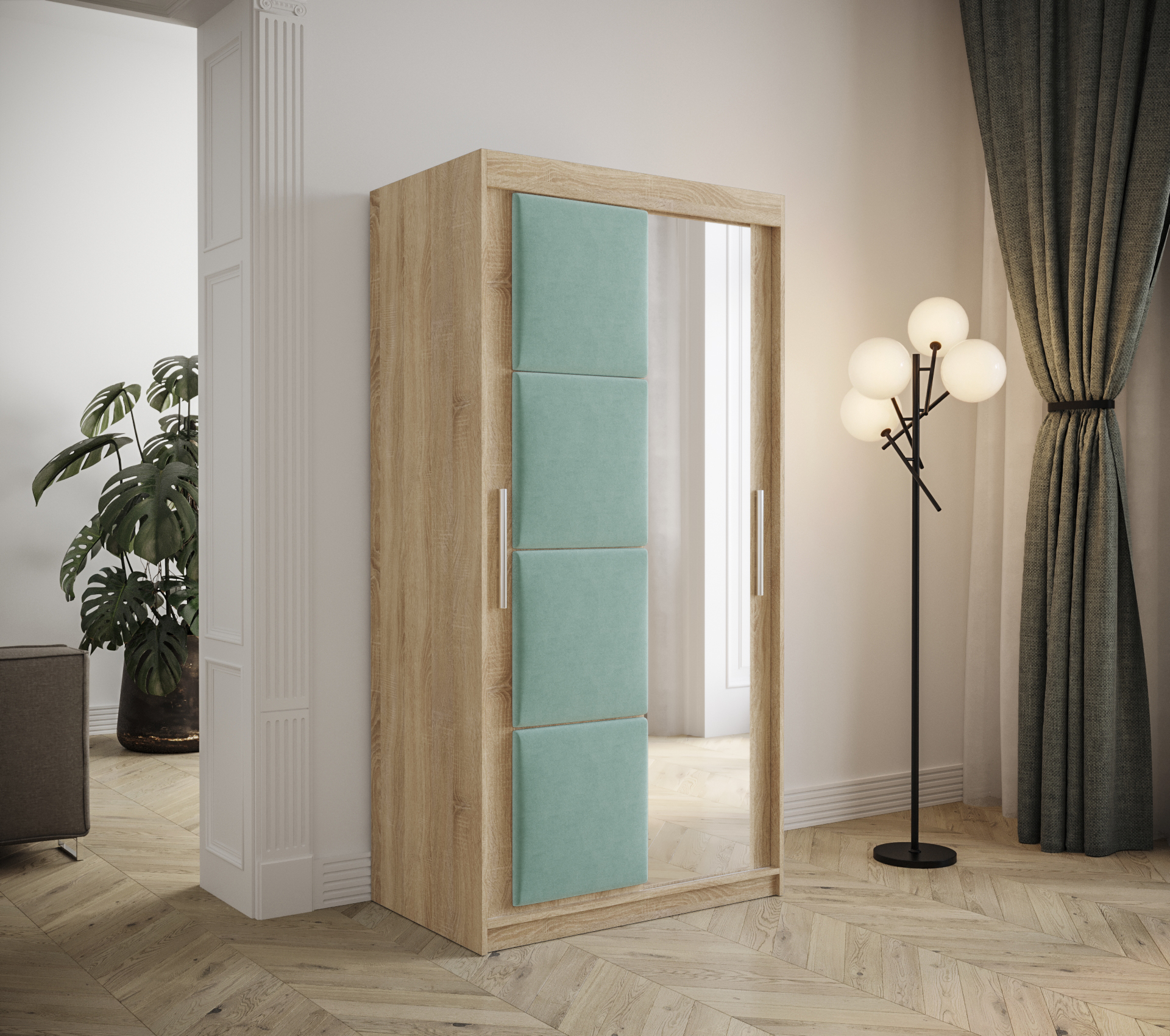Šatní skříň Abi Tapi je dostupná v několika barevných variantách korpusu, jako je dub artisan, černá a bílá. Také si můžete vybrat z různých odstínů čalouněných panelů, což vám umožní přizpůsobit skříň vašemu vkusu a stylu interiéru. Tímto způsobem snadno sladíte skříň s ostatním nábytkem ve vaší ložnici.