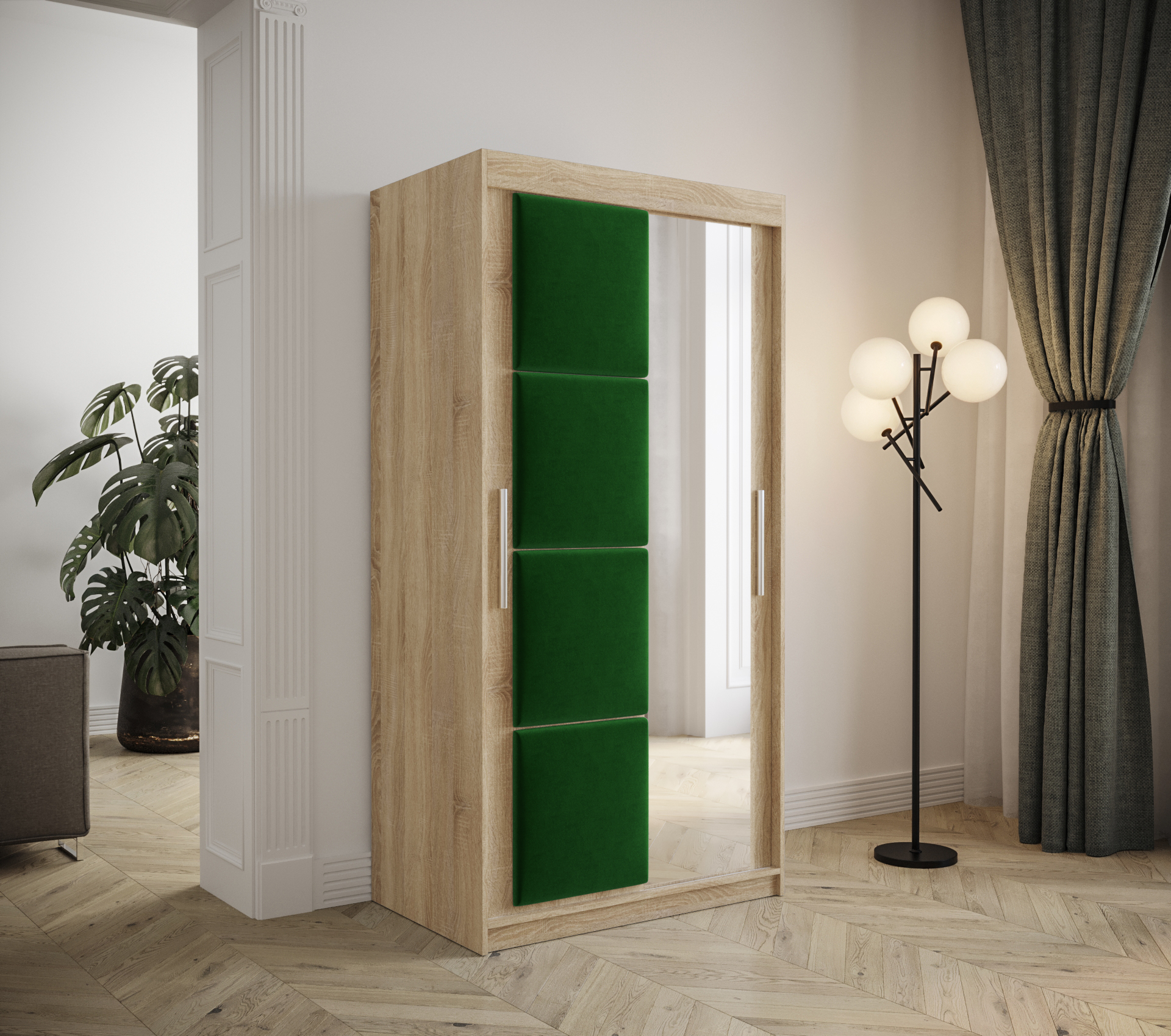- Ozdobné panely: Posuvné dveře jsou zdobeny čalouněnými panely, které dodávají skříni elegantní vzhled.