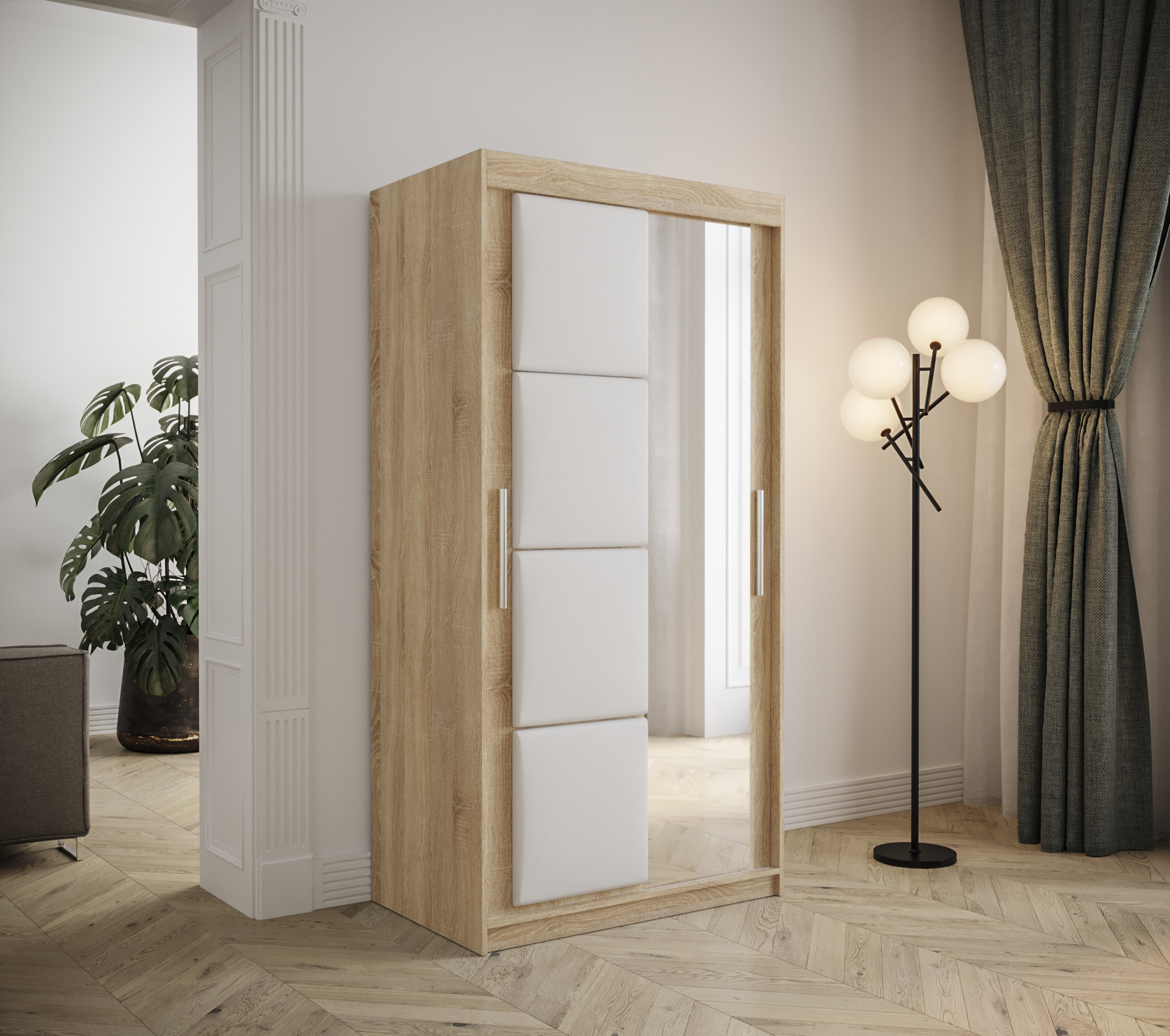 - Ozdobné čalouněné panely: Posuvné dveře jsou zdobeny čalouněnými panely, které dodávají skříni jedinečný vzhled.