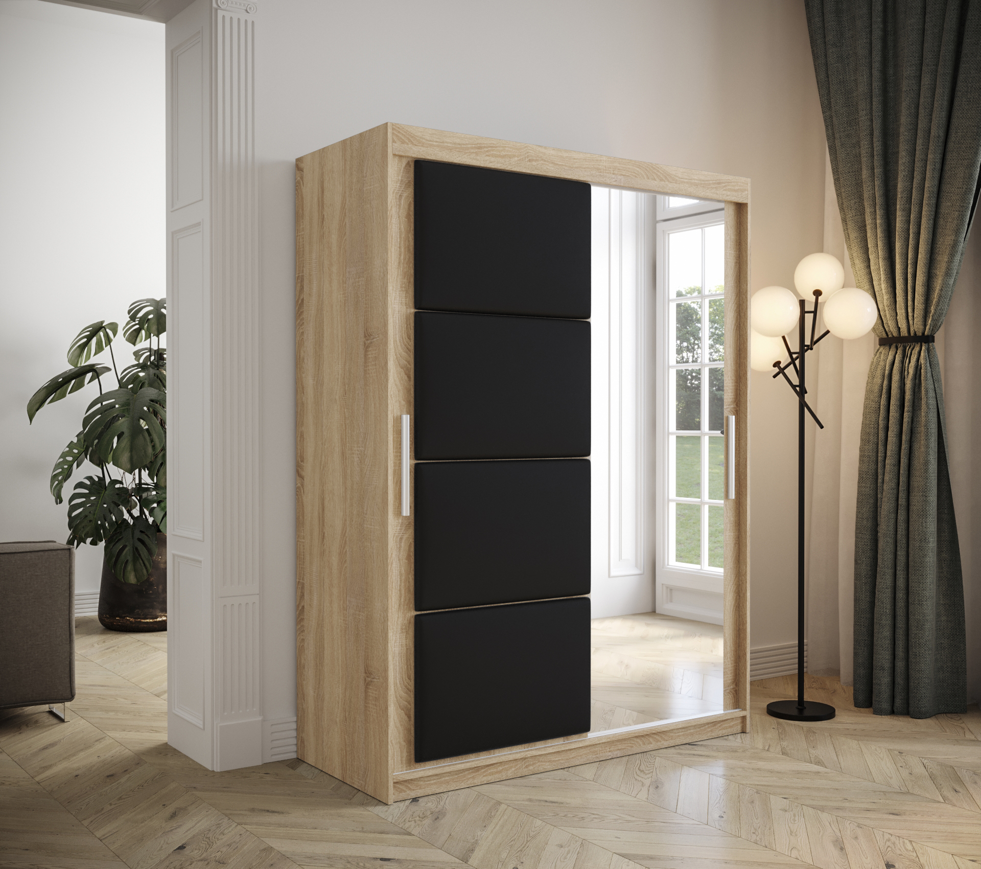 - Designové dveře: Posuvné dveře jsou zdobeny čalouněnými panely, které dodávají skříni jedinečný vzhled.