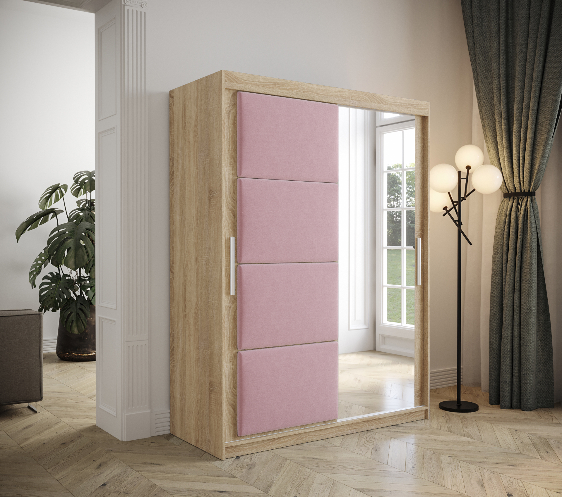 Korpus skříně je vyroben z kvalitní laminované dřevotřískové desky o síle 16 mm v atraktivní barvě Dub Sonoma. Posuvné dveře jsou zdobeny čalouněnými panely a leštěným zrcadlem, které opticky zvětší prostor a přidá na eleganci.