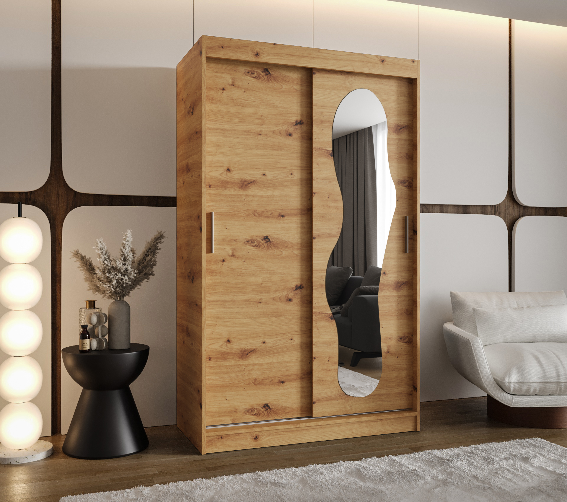 - Zrcadlo: Leštěné zrcadlo na dveřích skříně, které opticky zvětšuje prostor.