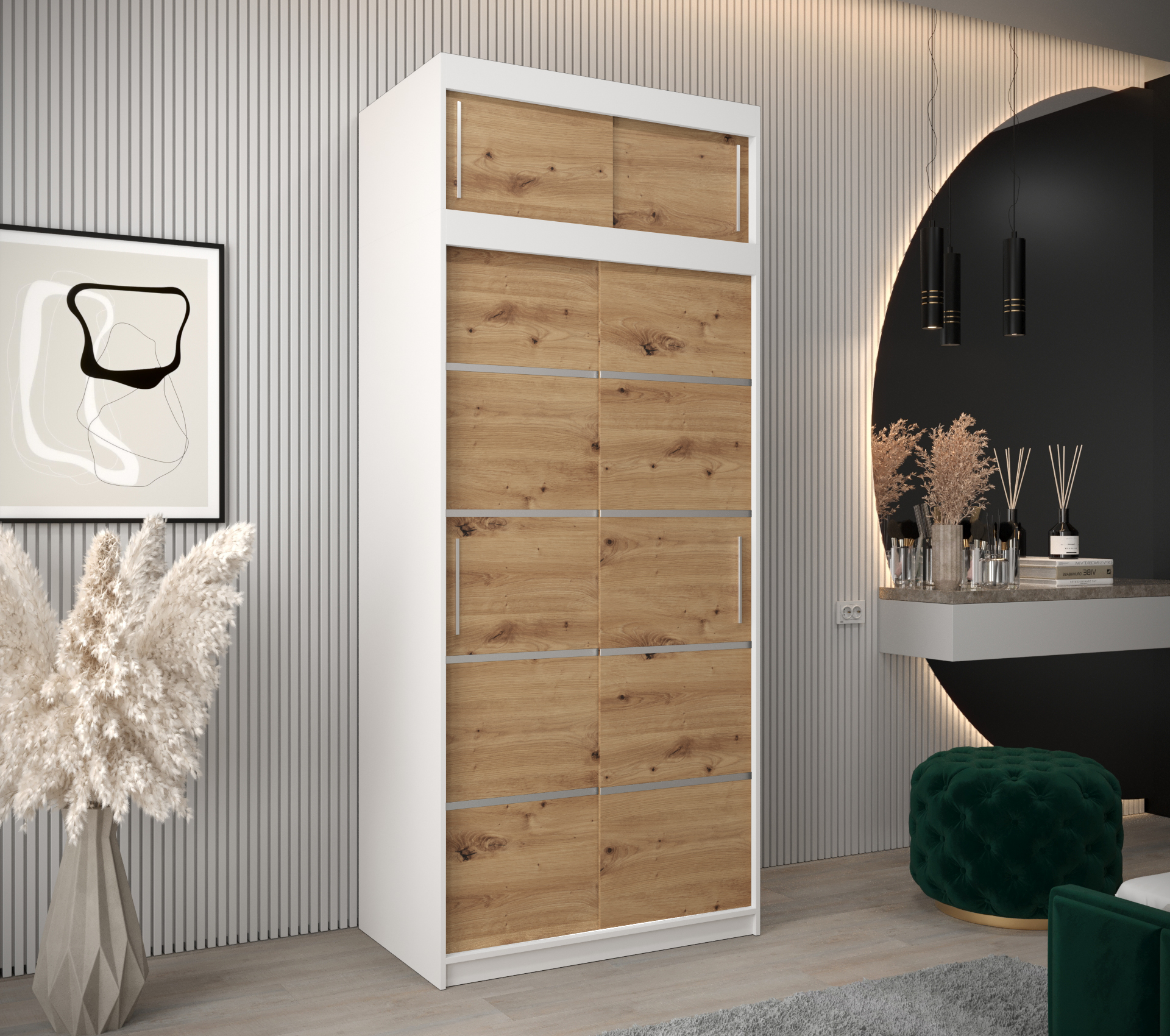- Estetické detaily: Posuvné dveře jsou ozdobeny stříbrnými plastovými pásky, které dodávají skříni elegantní vzhled.