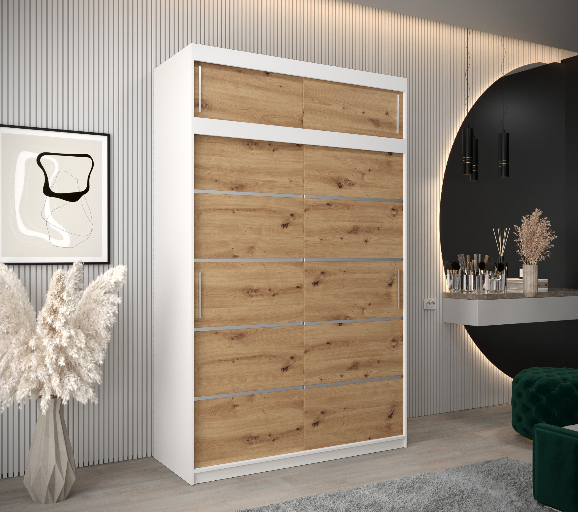 Šatní skříň Abi V1 s nástavcem je ideálním řešením pro ty, kteří hledají moderní a praktický úložný prostor. Díky svému originálnímu vzhledu a kvalitnímu zpracování se stane skvělým doplňkem vaší ložnice. Korpus skříně je vyroben z kvalitní laminované dřevotřískové desky, což zaručuje její dlouhou životnost a odolnost. Posuvné dveře jsou dostupné v dekoru dub artisan, který dodává skříni elegantní vzhled.