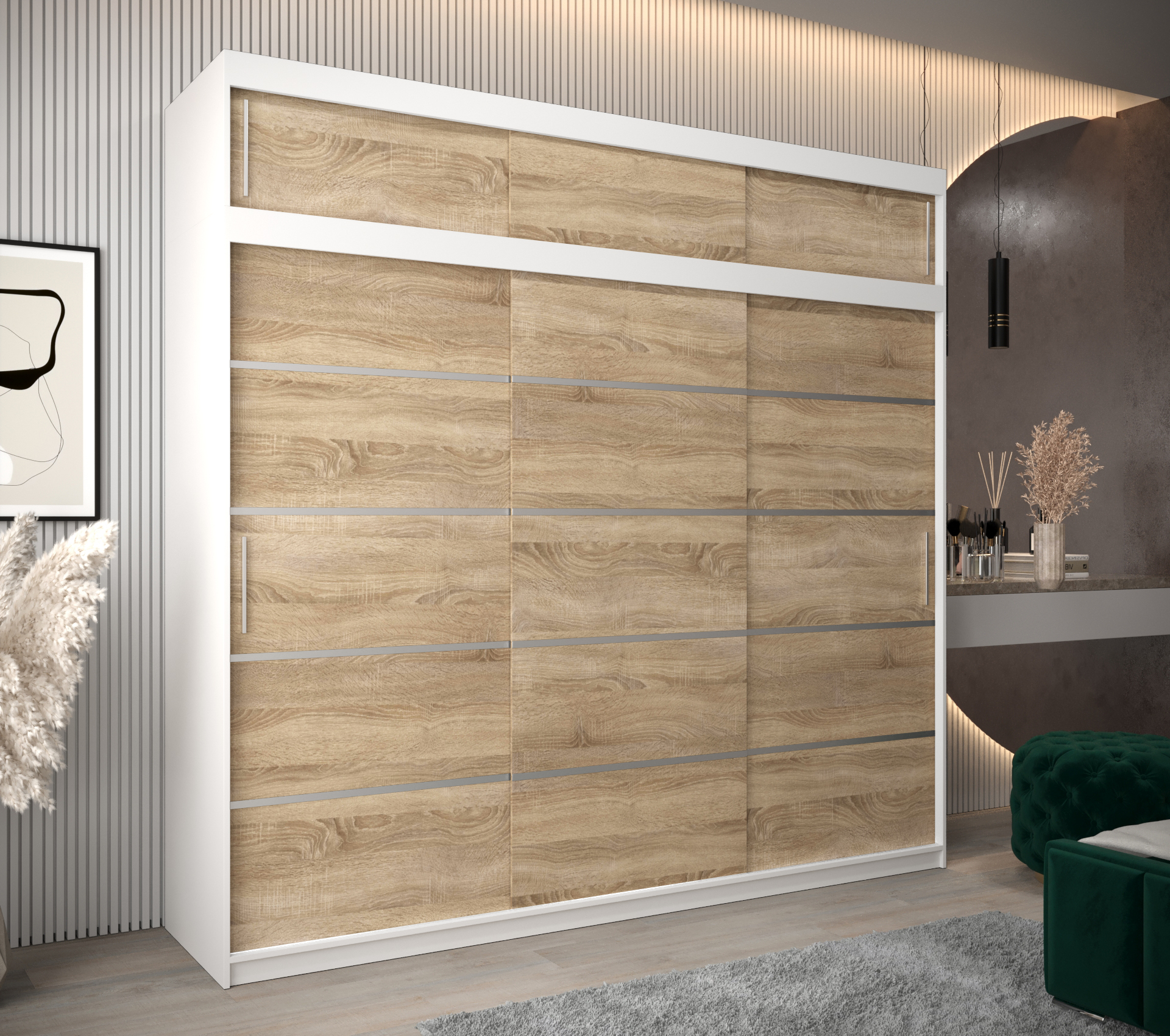 - Ozdobné pásky: Posuvné dveře jsou stylově zdobené stříbrnými plastovými pásky.