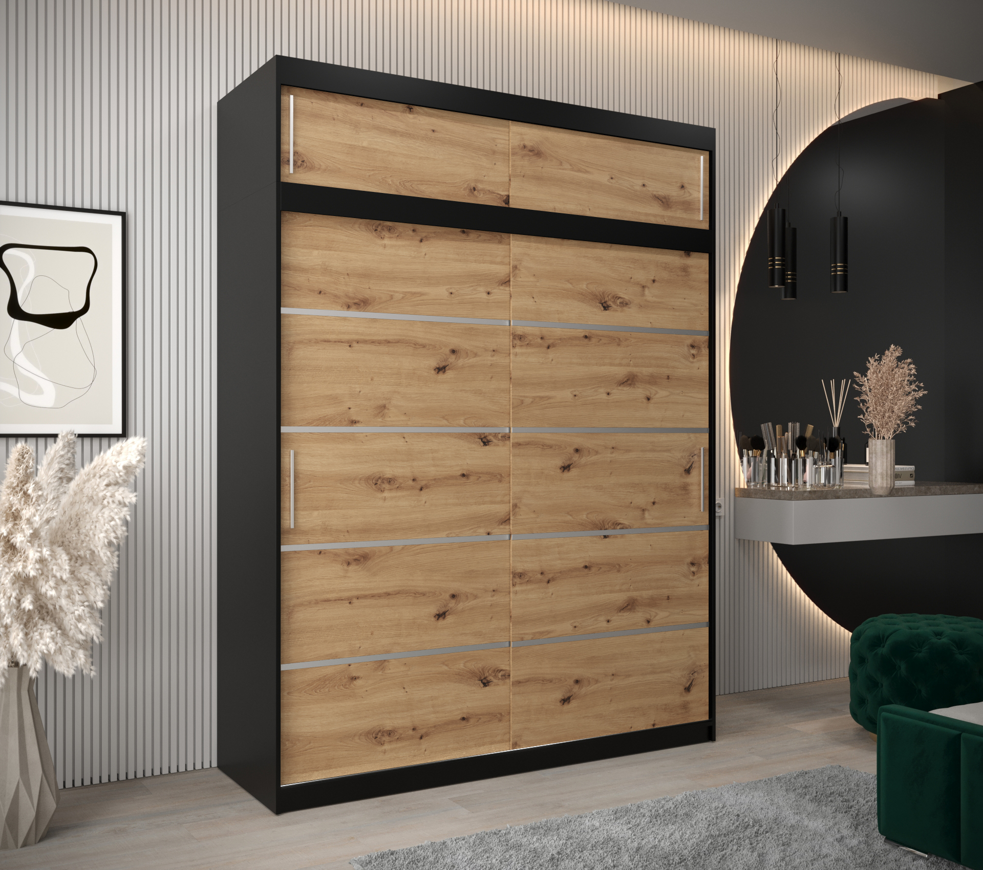 Šatní skříň Abi V1 s nástavcem představuje ideální řešení pro všechny, kteří hledají moderní a stylový nábytek do své ložnice. S jejími elegantními posuvnými dveřmi a černým korpusem se stane skvělým doplňkem každého interiéru.