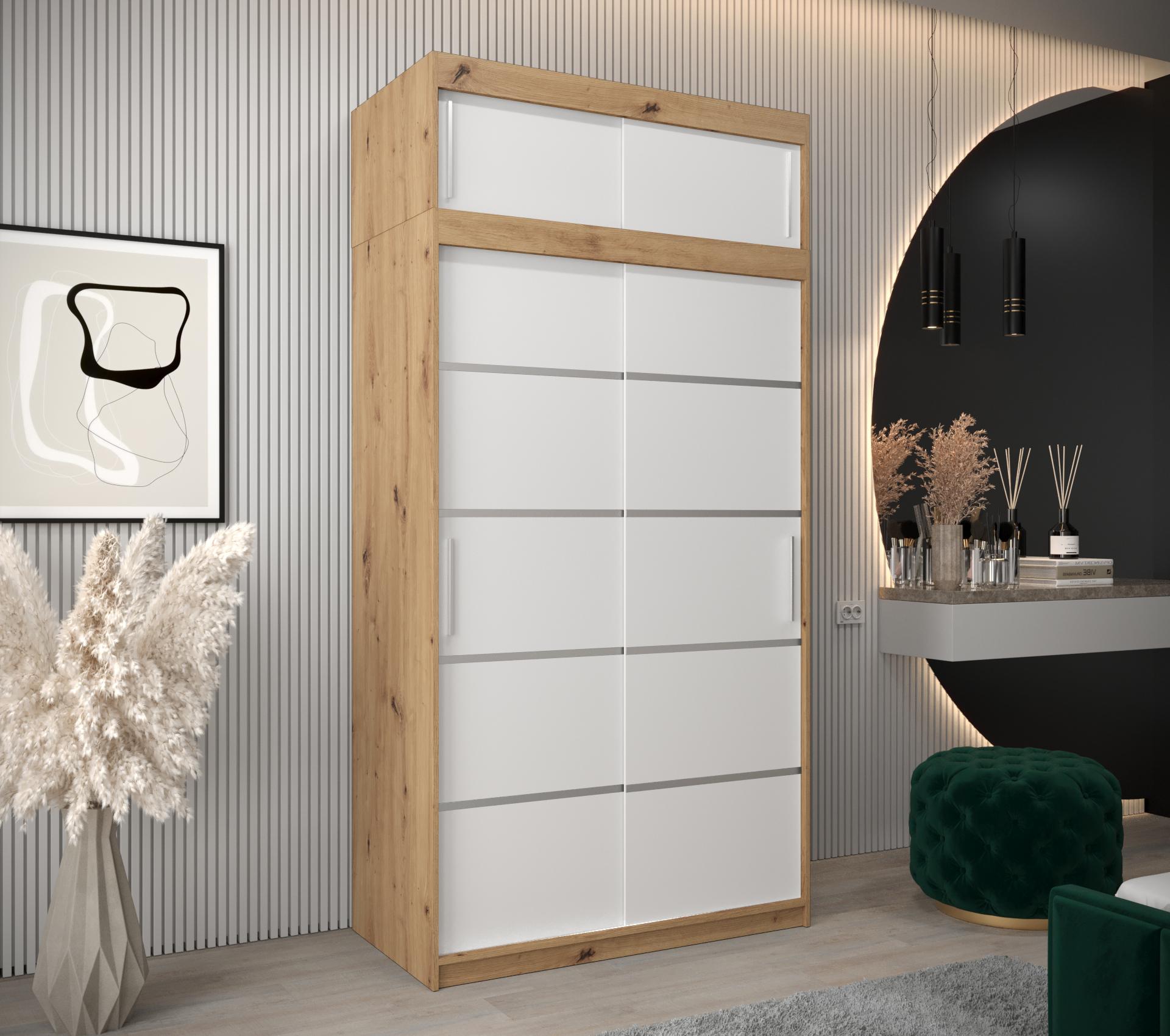 Šatní skříň Abi V1 s nástavcem v dekoru dub artisan představuje ideální volbu pro moderní interiéry. Její elegantní design a funkčnost z ní činí perfektní doplněk do vaší ložnice. S rozměry 120 cm nabízí dostatek úložného prostoru pro všechny vaše oblečení a doplňky.