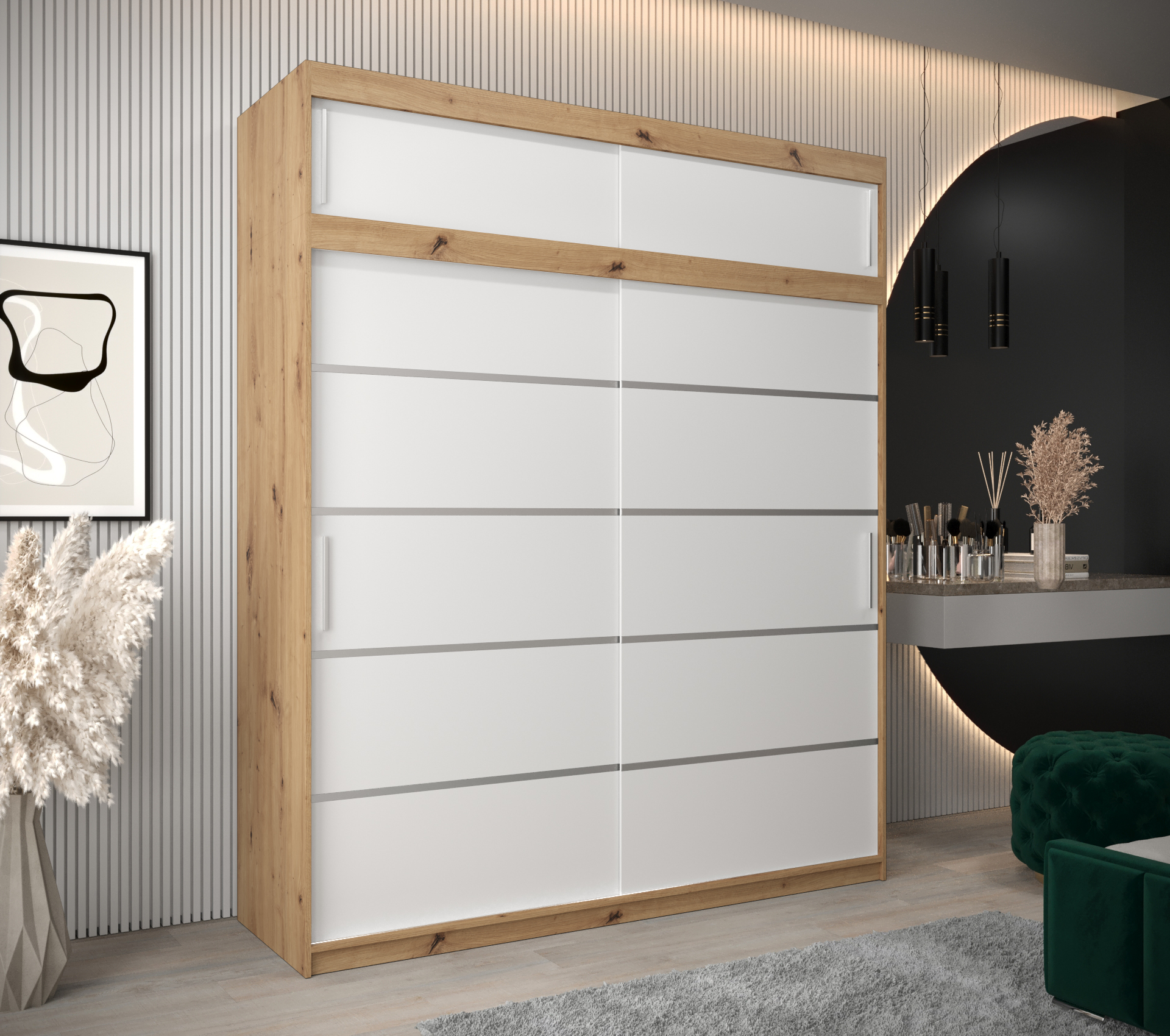 - Vnitřní uspořádání: Skříň nabízí dvě šatní tyče a police, s možností dokoupení zásuvek pro ještě větší úložný prostor.