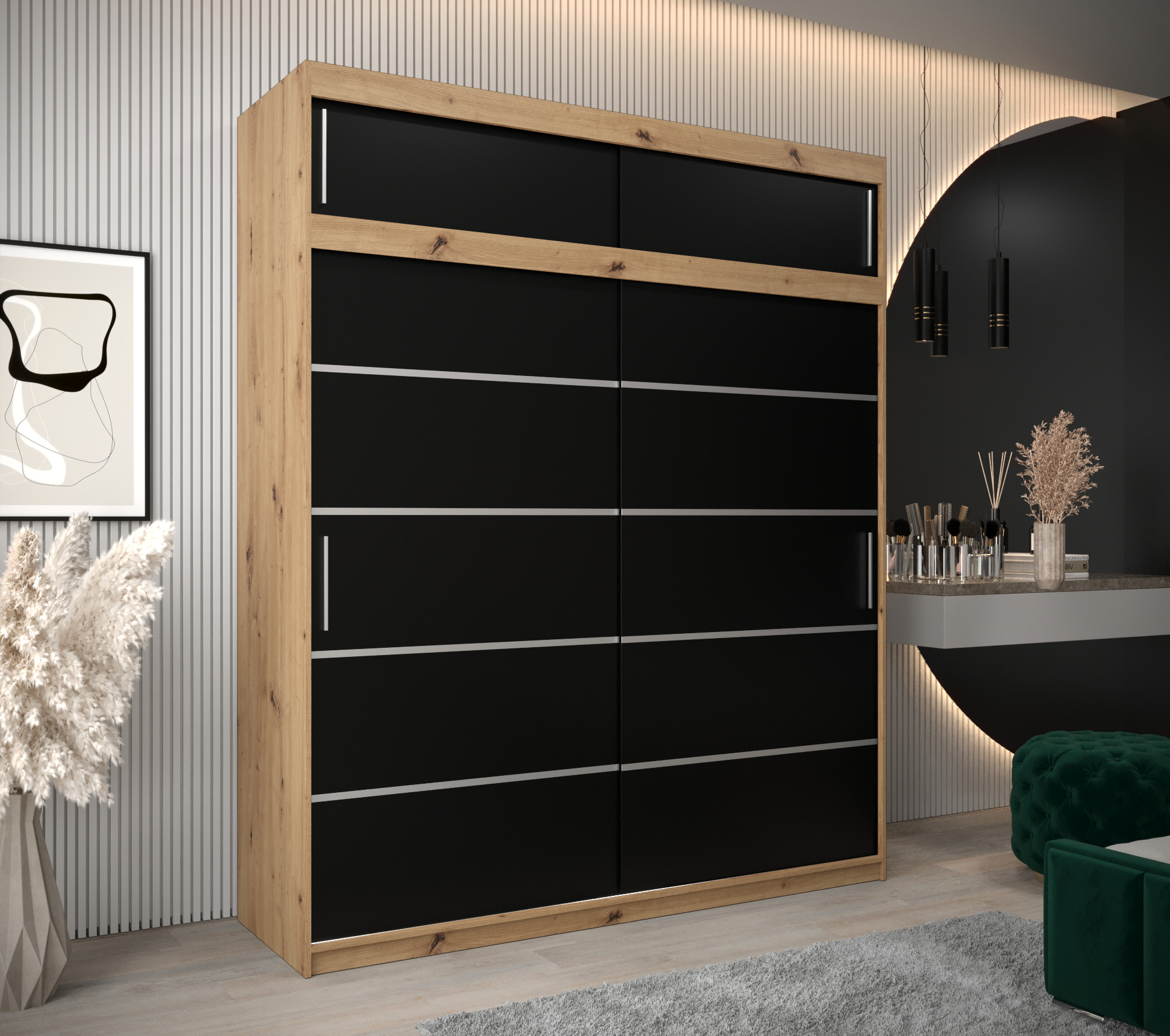 Šatní skříň Abi V1 s nástavcem je dostupná v různých rozměrech, včetně šířek 100 cm, 120 cm, 150 cm, 180 cm, 200 cm a 250 cm. Celková výška skříně dosahuje 240 cm, což umožňuje maximální využití prostoru. Skříň je k dispozici v dekorech dub artisan, dub sonoma, černé a bílé.