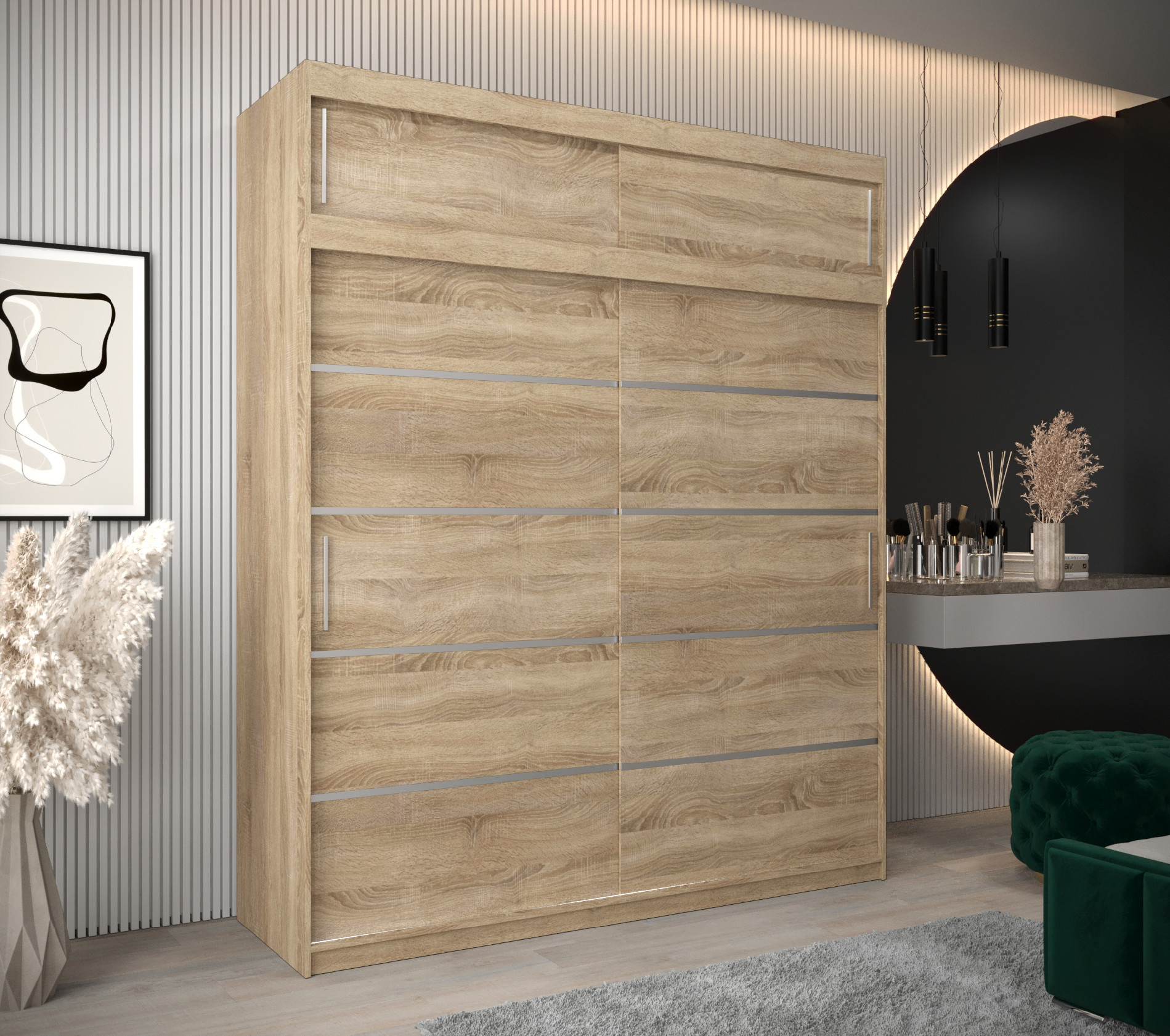 - Ozdobné pásky: Posuvné dveře jsou doplněny stříbrnými plastovými pásky, které dodávají skříni elegantní vzhled.