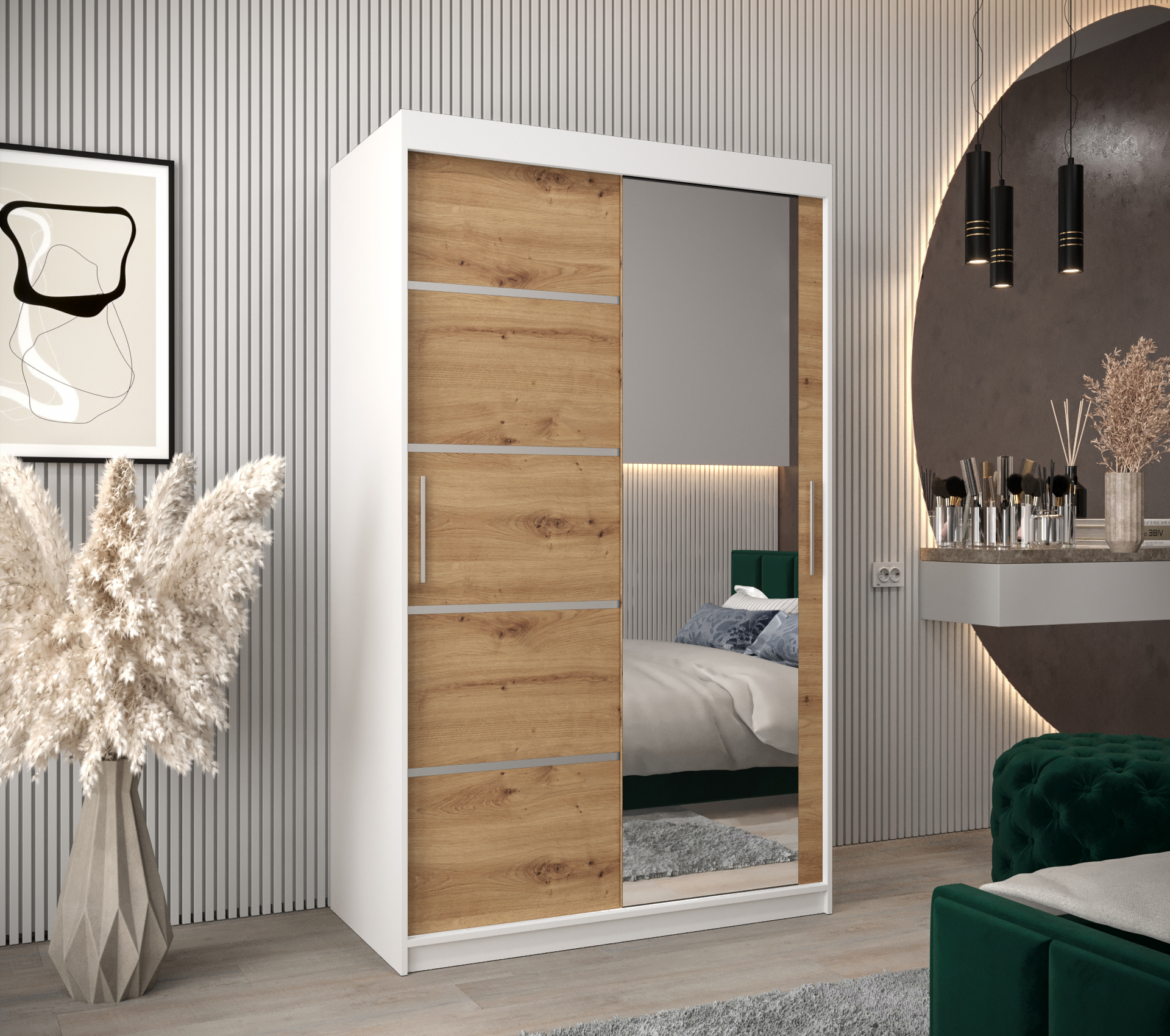 Šatní skříň Abi V2 představuje ideální kombinaci moderního designu a praktického úložného prostoru. Její korpus v elegantní bílé barvě je doplněn o posuvné dveře v dekoru dub artisan, což z ní činí stylový kousek do každé ložnice.