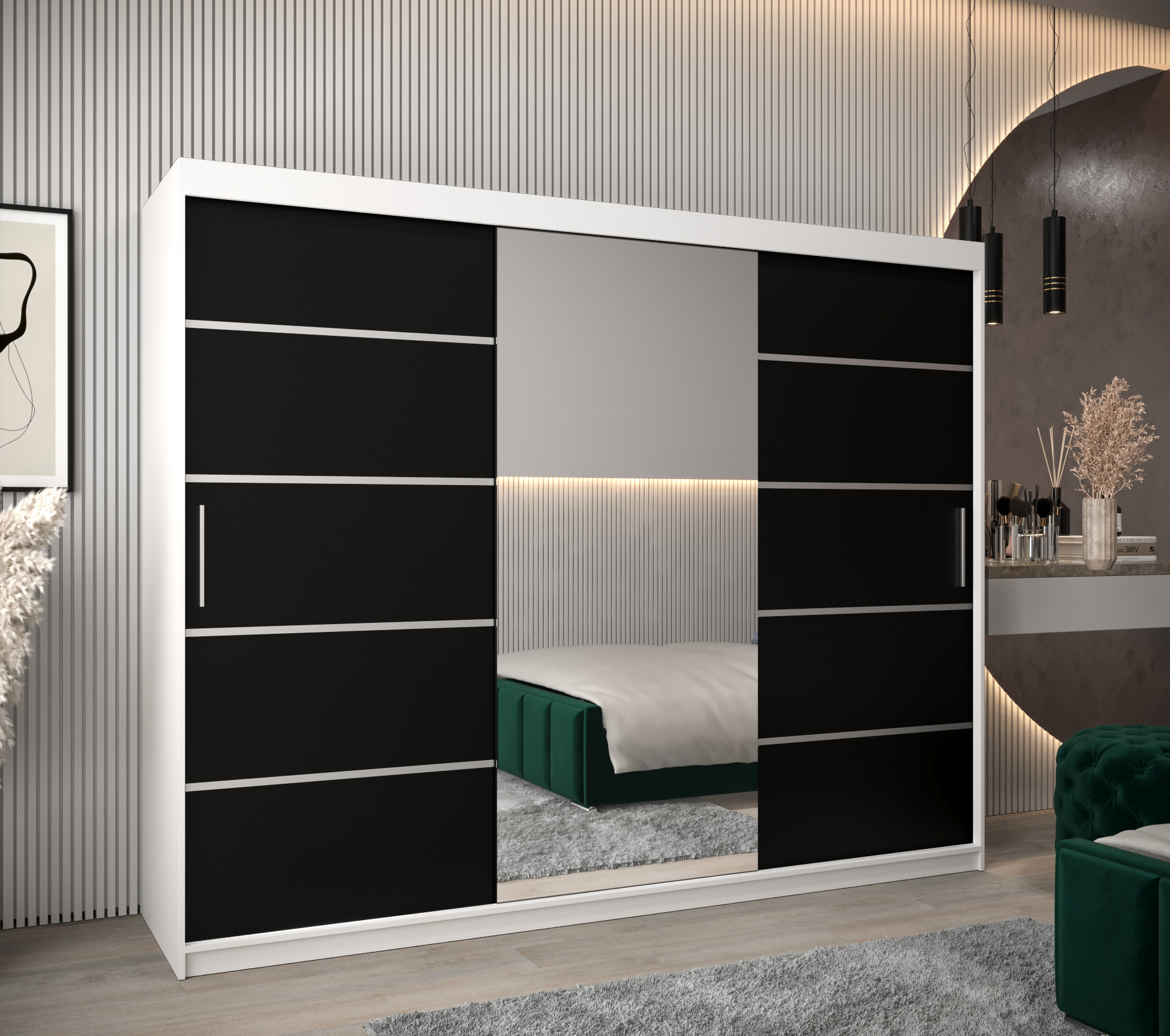 - Zrcadlo: Leštěné zrcadlo na dveřích opticky zvětšuje prostor a přidává na eleganci.