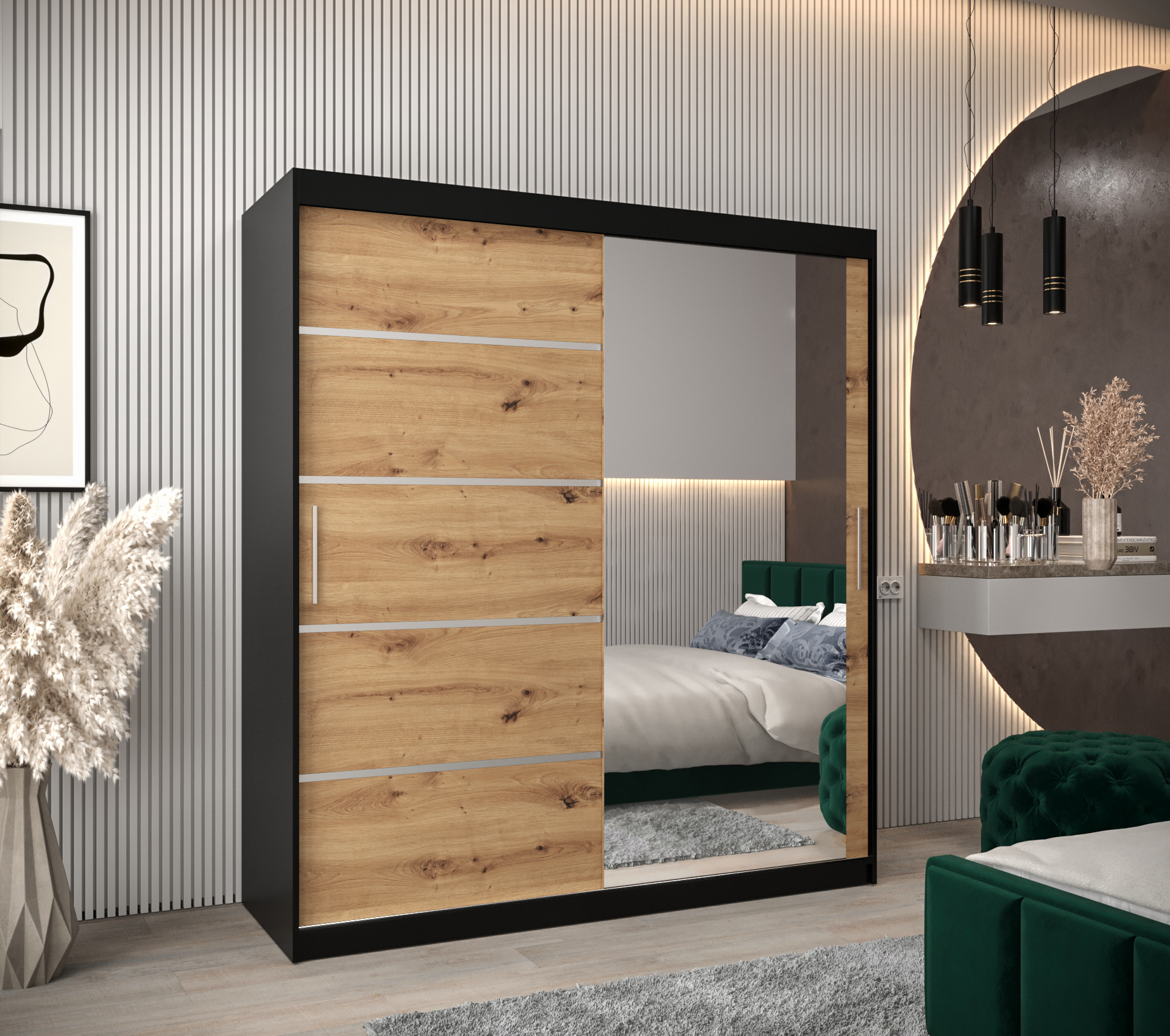 Pokud hledáte stylovou a funkční šatní skříň, šatní skříň Abi V2 je ideální volbou pro vaši ložnici. S jejími posuvnými dveřmi a elegantním designem se stane atraktivním prvkem každého interiéru. Korpus skříně je vyroben z kvalitní laminované dřevotřísky v černé barvě, zatímco dveře jsou z dekoru dub artisan, což dodává skříni moderní vzhled.