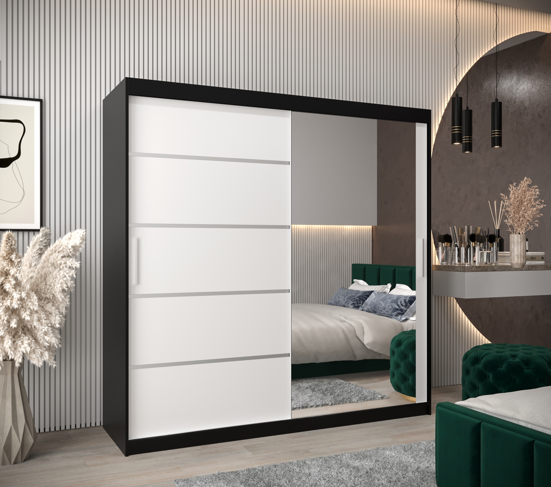 - Stylové detaily: Posuvné dveře jsou doplněny o stříbrné plastové pásky, které dodávají skříni moderní vzhled. Na dveřích je také leštěné zrcadlo, které opticky zvětší prostor.