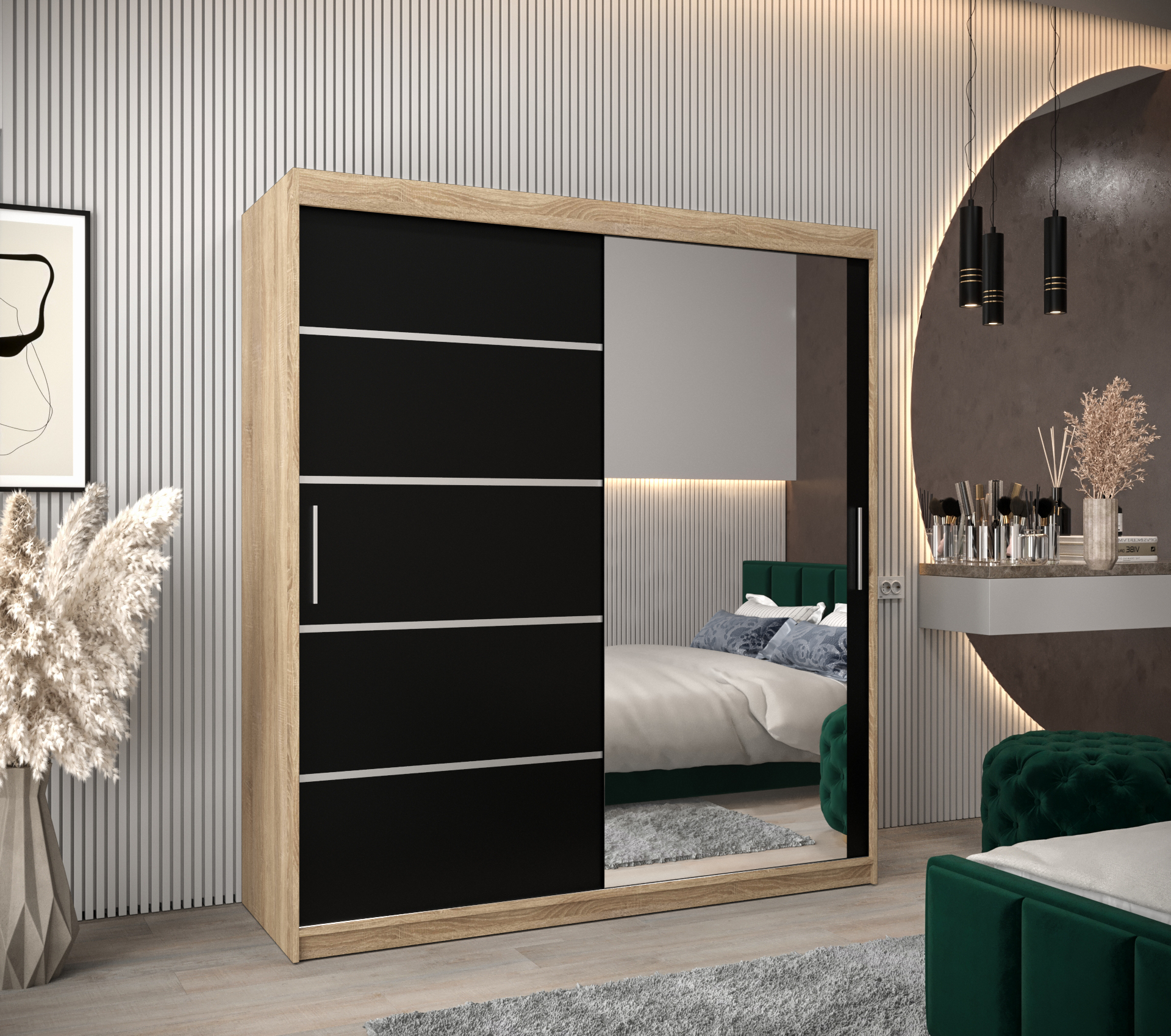 Šatní skříň Abi V2 je perfektní volbou pro ty, kteří hledají moderní a stylový nábytek. Její elegantní design v dekoru dub sonoma s černými posuvnými dveřmi dodá vašemu interiéru nádech elegance a funkčnosti.