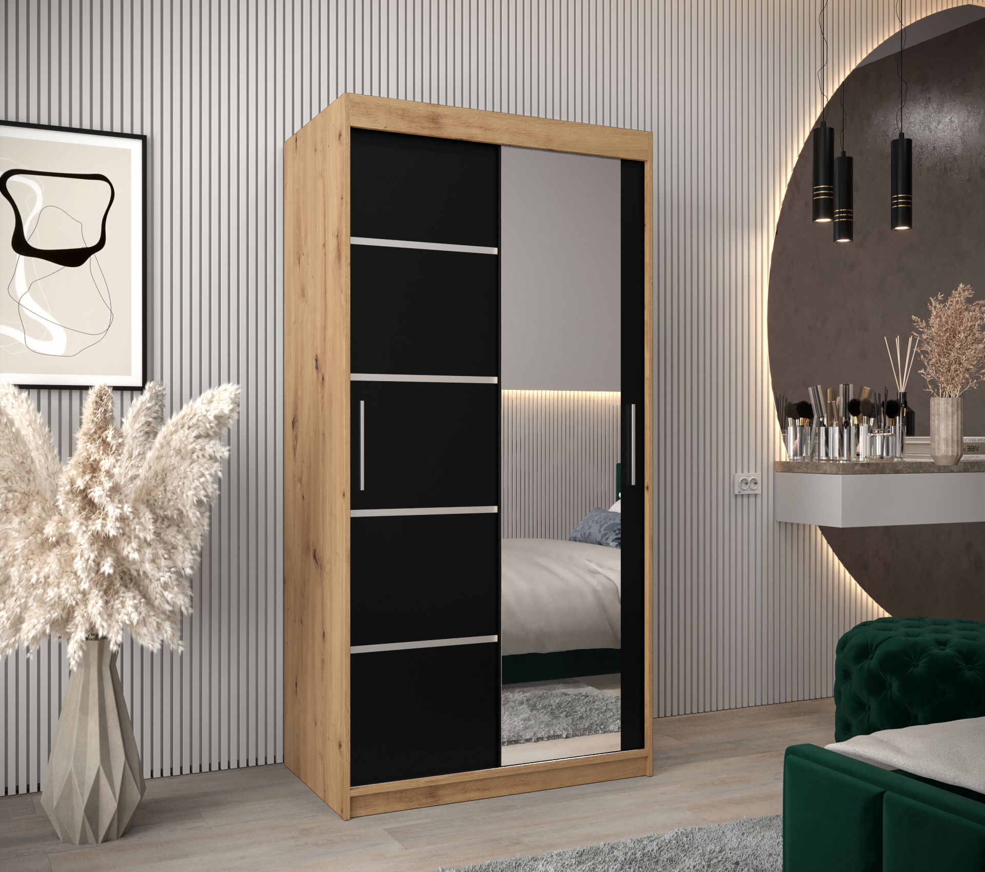 Skříň je dostupná v několika barevných variantách, včetně dub artisan, dub sonoma, černé a bílé. Tyto odstíny lze vzájemně kombinovat, což umožňuje vytvoření jedinečného interiéru.