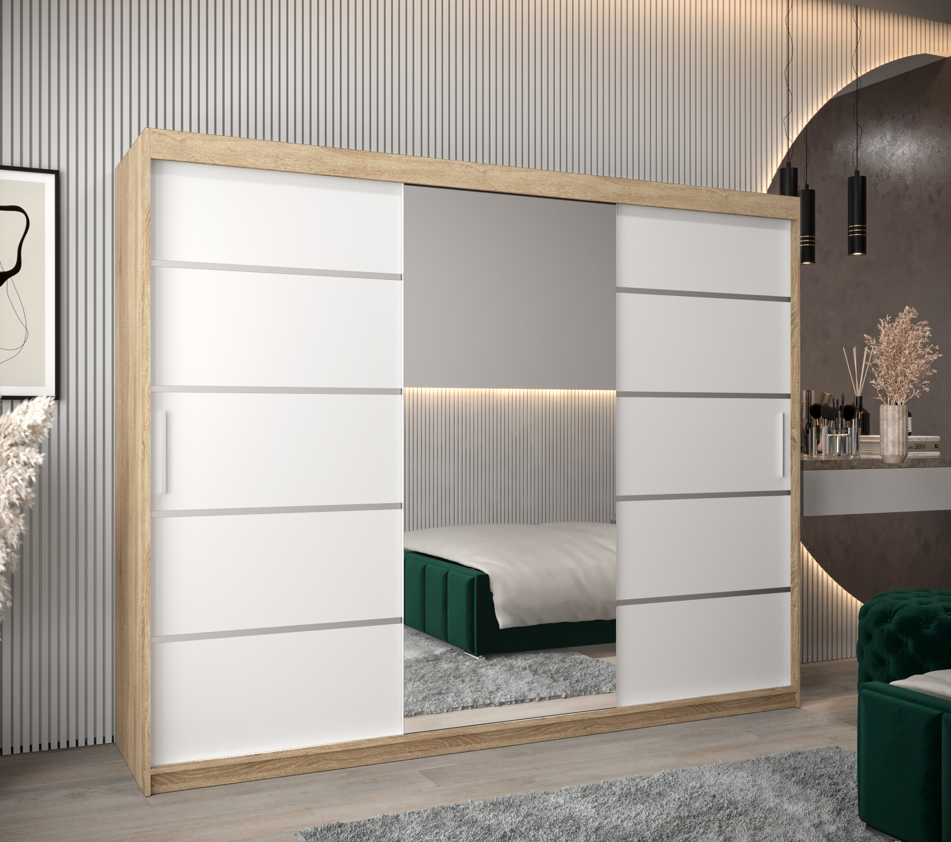 - Ozdobné pásky: Posuvné dveře jsou zdobeny stříbrnými plastovými pásky, které dodávají skříni moderní vzhled.