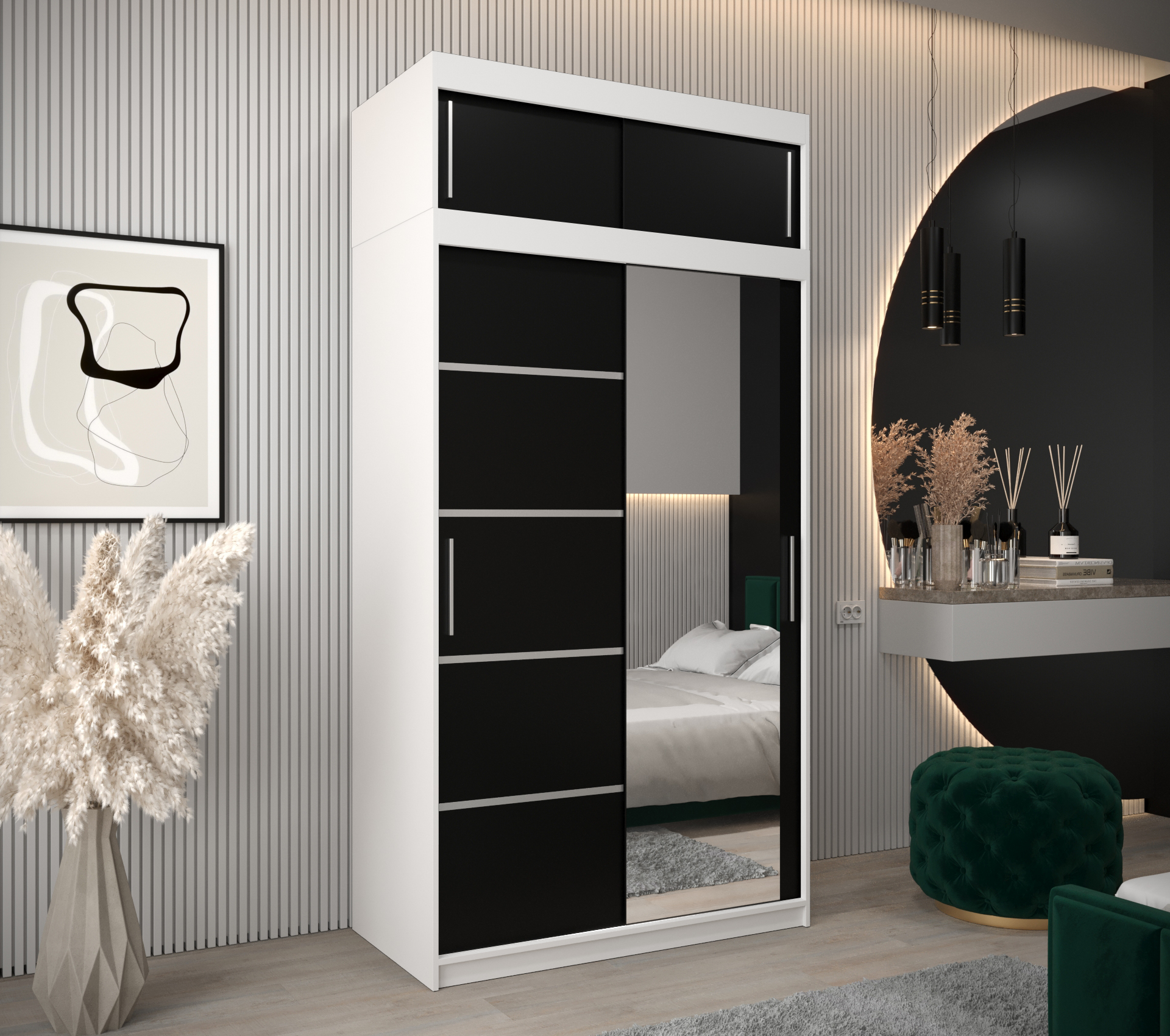 Šatní skříň Abi V2 s nástavcem představuje ideální volbu pro každého, kdo hledá moderní a praktický nábytek do ložnice. S elegantním bílým korpusem a černými posuvnými dveřmi se tato skříň skvěle hodí do jakéhokoli interiéru.