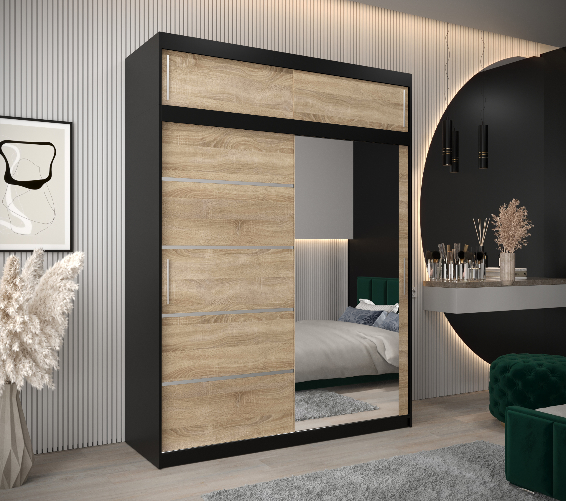 Šatní skříň Abi V2 je ideálním řešením pro každou moderní ložnici. S posuvnými dveřmi a elegantním designem, který kombinuje černý korpus s dveřmi v dekoru dub sonoma, přináší do vašeho interiéru styl a praktičnost.
