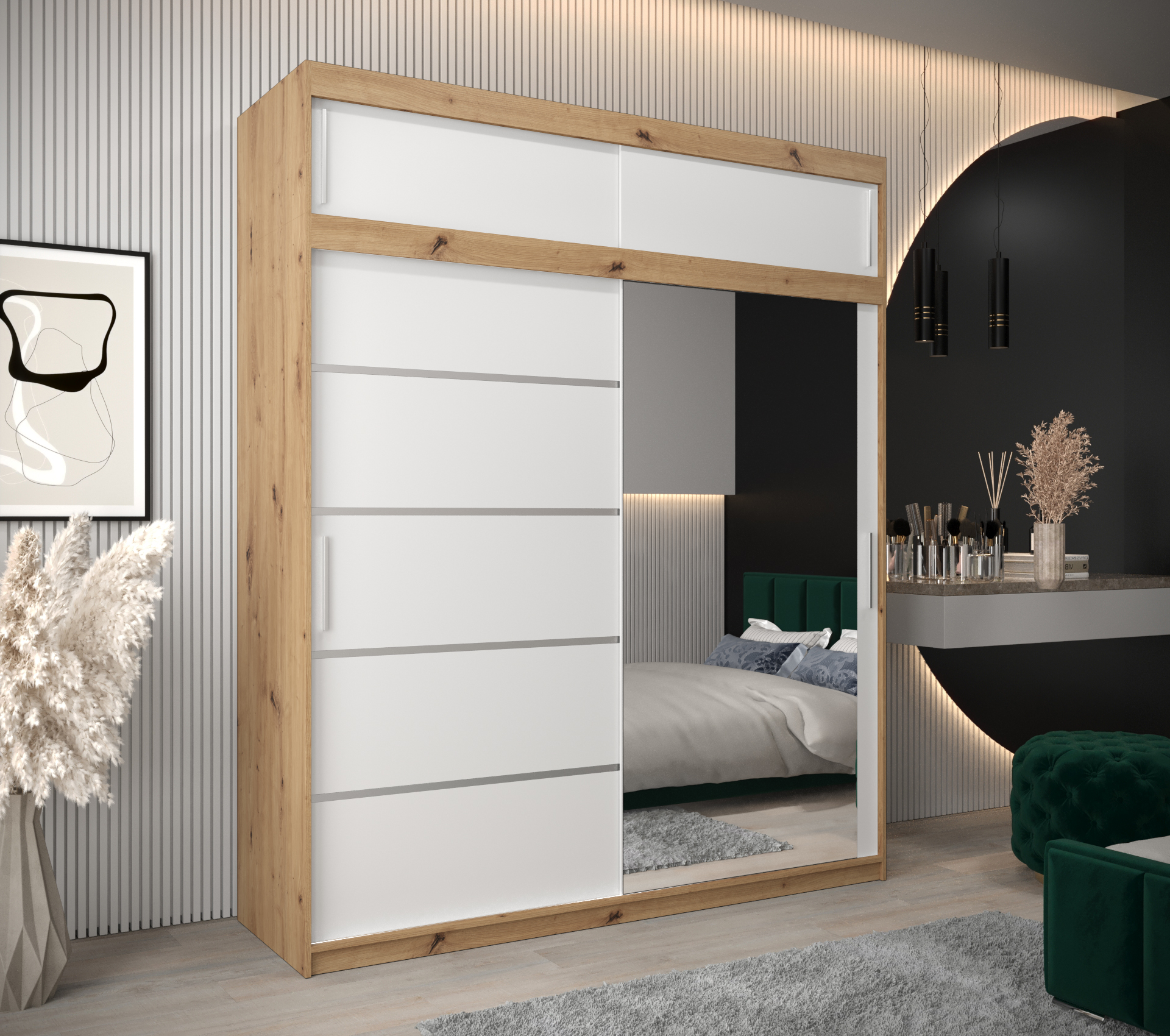 - Zrcadlo: Vybavení skříně zahrnuje leštěné zrcadlo na dveřích, které opticky zvětšuje prostor.