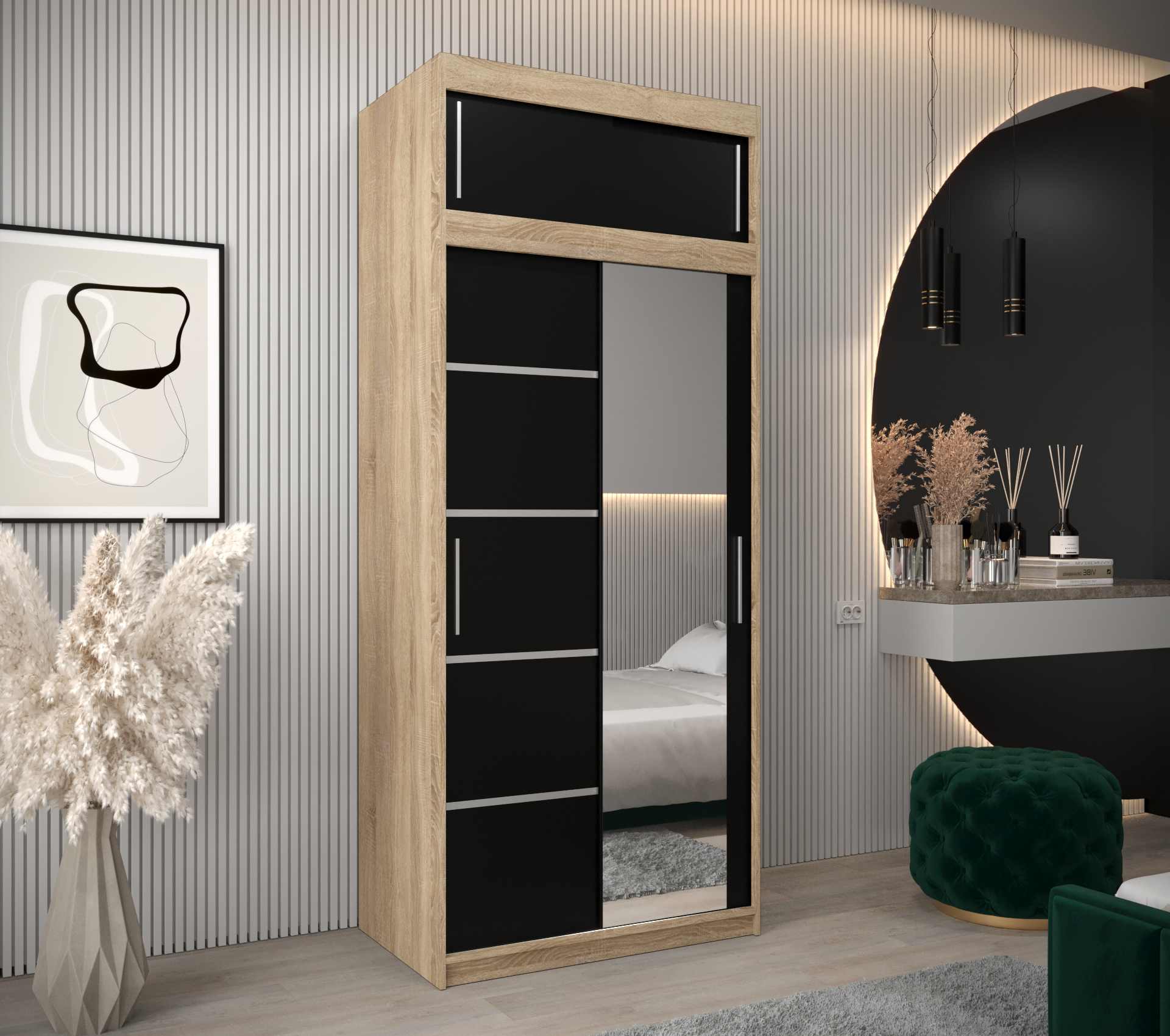 Získejte moderní šatní skříň s nástavcem, která kombinuje styl a funkčnost. Nabízí dostatek úložného prostoru a elegantní design pro vaši ložnici.