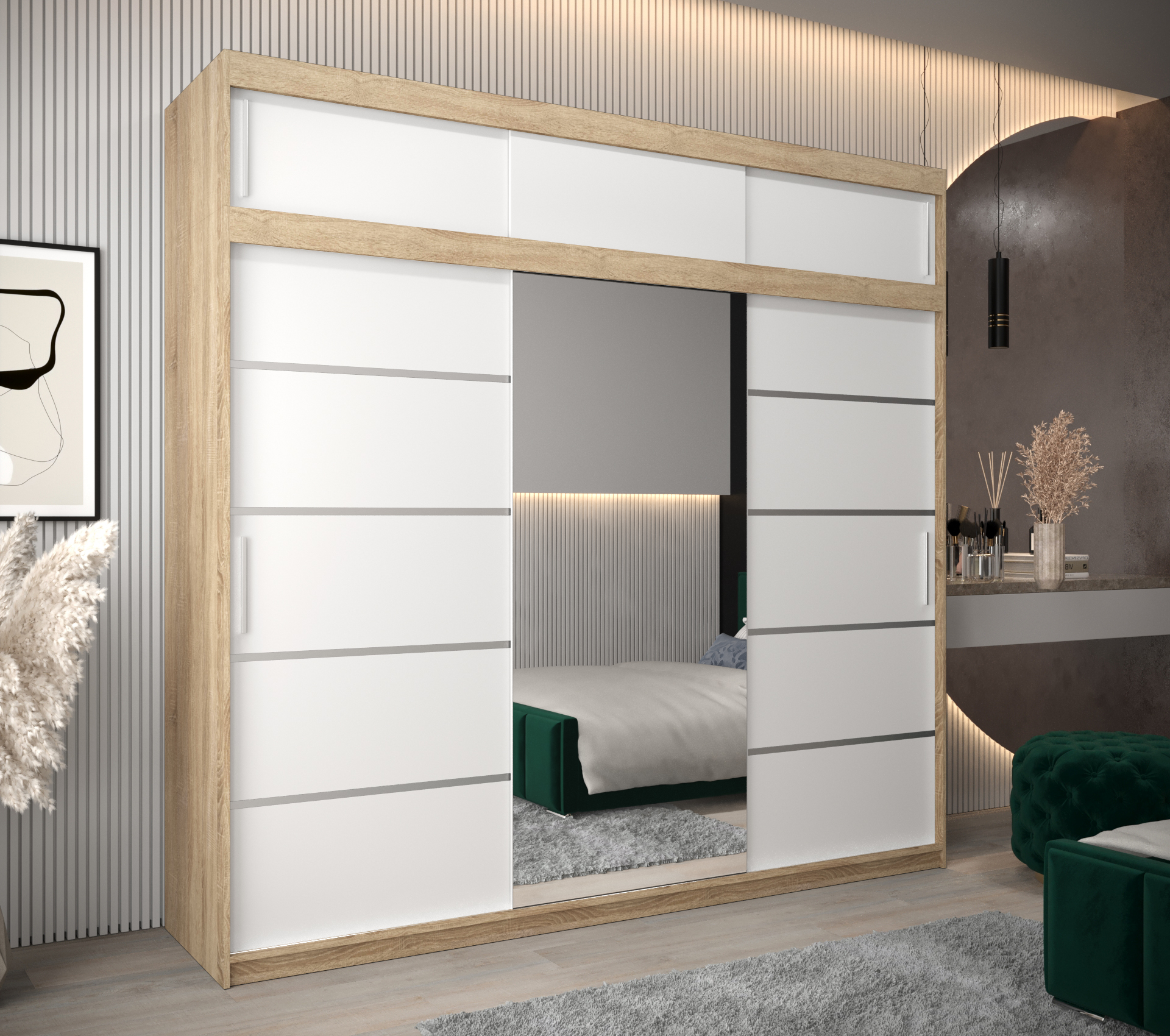 - Ozdobné pásky: Posuvné dveře jsou doplněny stříbrnými plastovými pásky, které dodávají skříni elegantní vzhled.