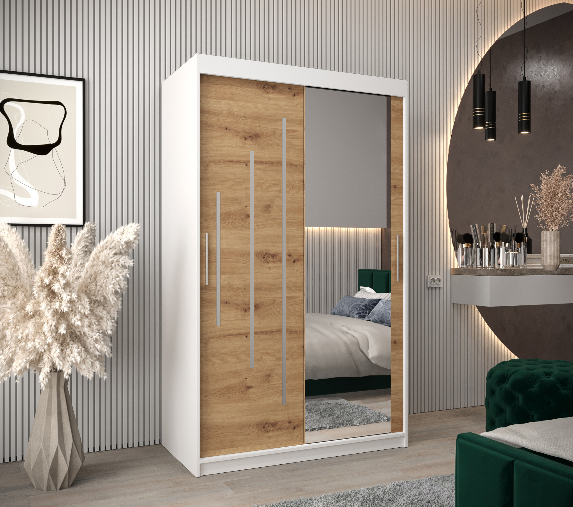 - Zrcadlo: Součástí skříně je zrcadlo, které opticky zvětšuje prostor a přidává na praktičnosti.