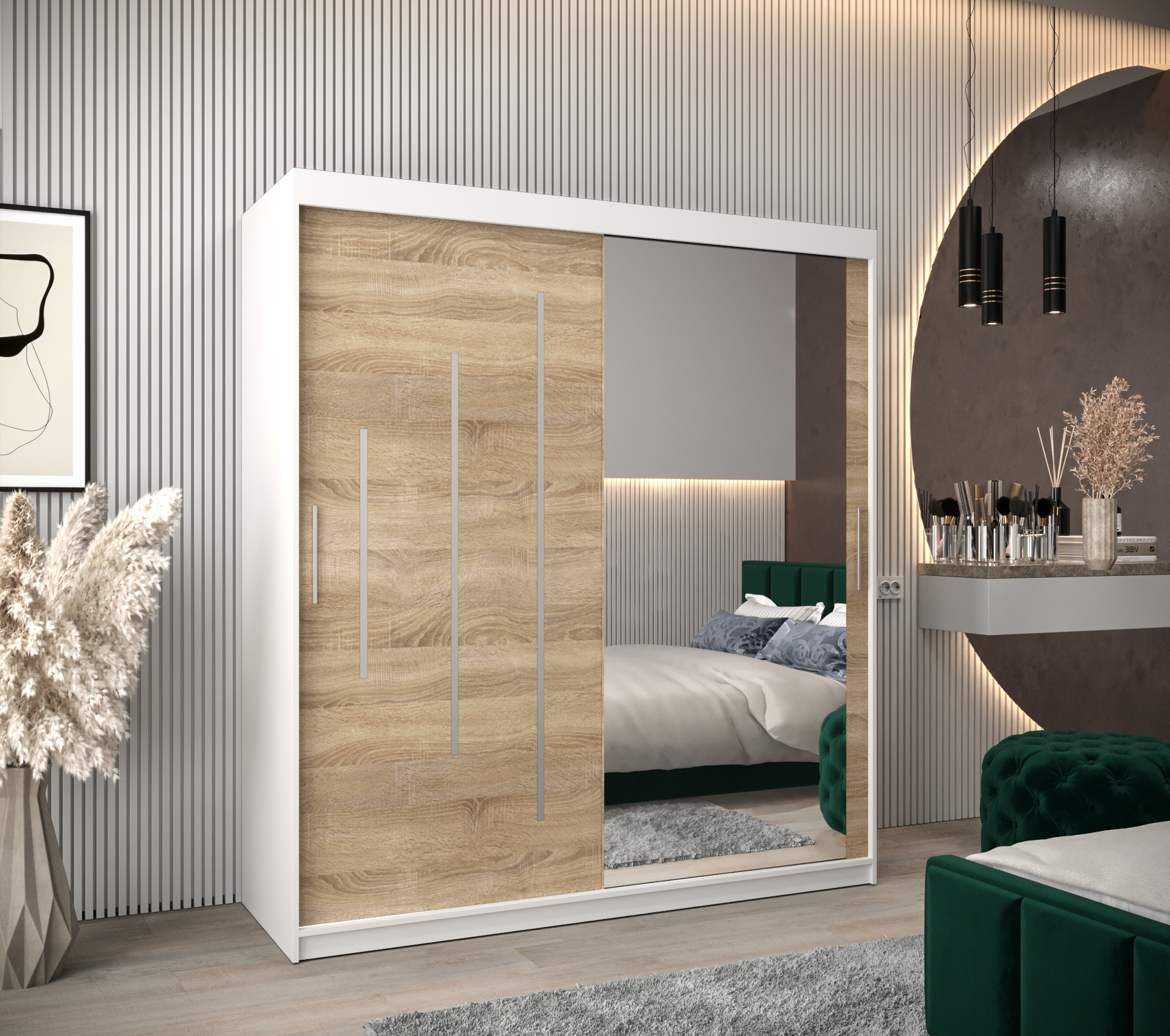Šatní skříň Abi Y2 je ideálním řešením pro každého, kdo hledá moderní a funkční nábytek do ložnice. S posuvnými dveřmi a kombinací bílé barvy s dekorem dub sonoma přináší do vašeho interiéru nádech elegance a stylu.