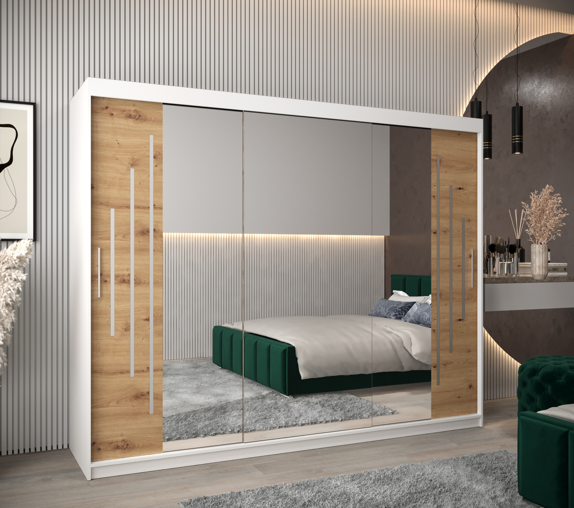 - Zrcadlo: Skříň je vybavena zrcadlem, což opticky zvětšuje prostor a přidává na praktičnosti.