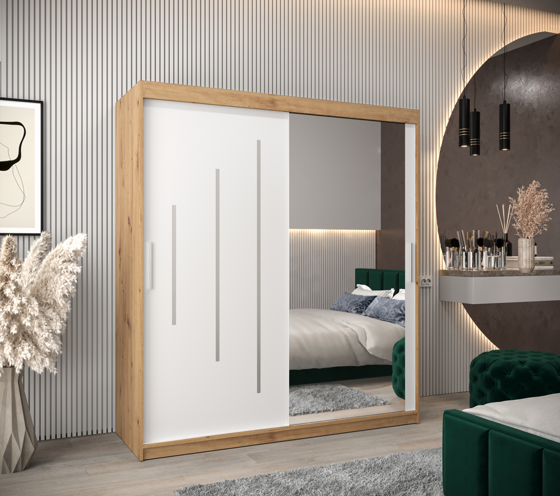 - Zrcadlo: Součástí skříně je elegantní zrcadlo, které opticky zvětšuje prostor.