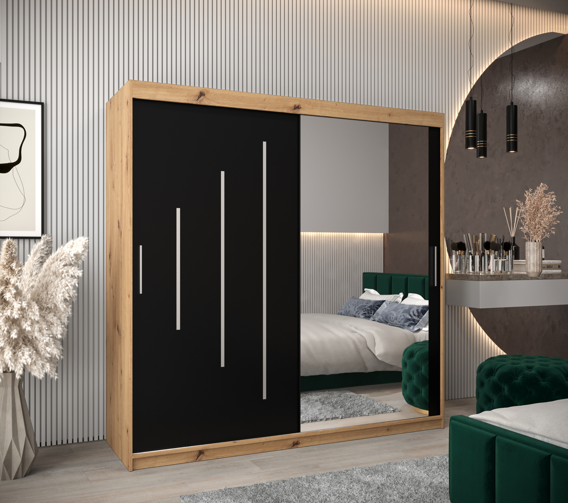 Celkové rozměry skříně jsou 200 cm na výšku, 62 cm na šířku a hloubka desky je 16 mm. Můžete si vybrat z různých šířek od 100 cm do 250 cm, aby skříň přesně vyhovovala vašim potřebám.