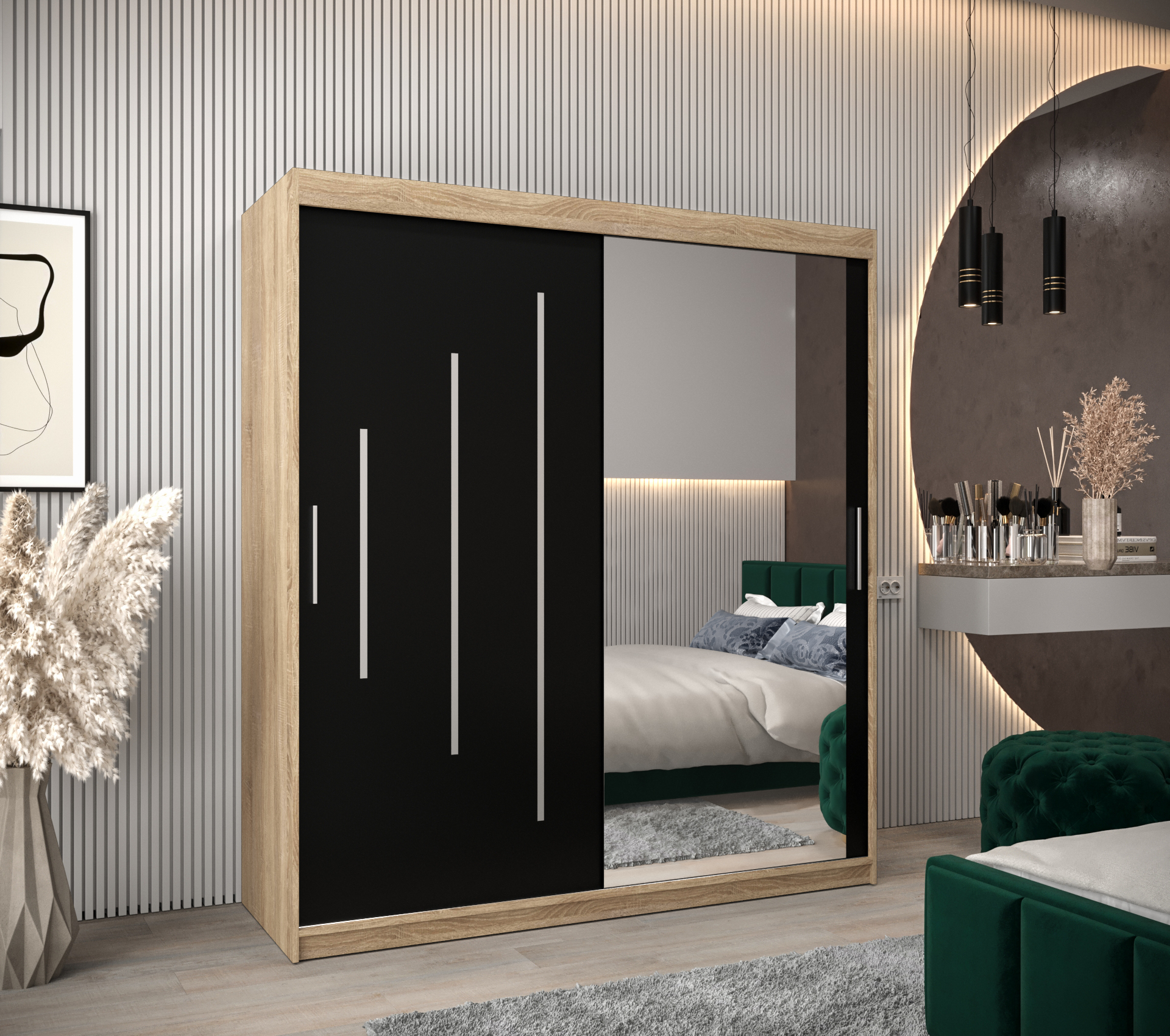 - Stylový design: Černé posuvné dveře s ozdobnými stříbrnými pásky dodávají skříni moderní vzhled, který se hodí do jakéhokoli interiéru.