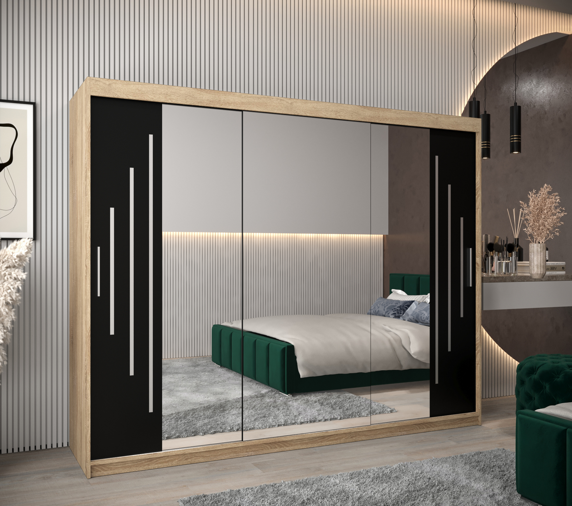 - Zrcadlo: Skříň obsahuje zrcadlo, které opticky zvětšuje prostor.