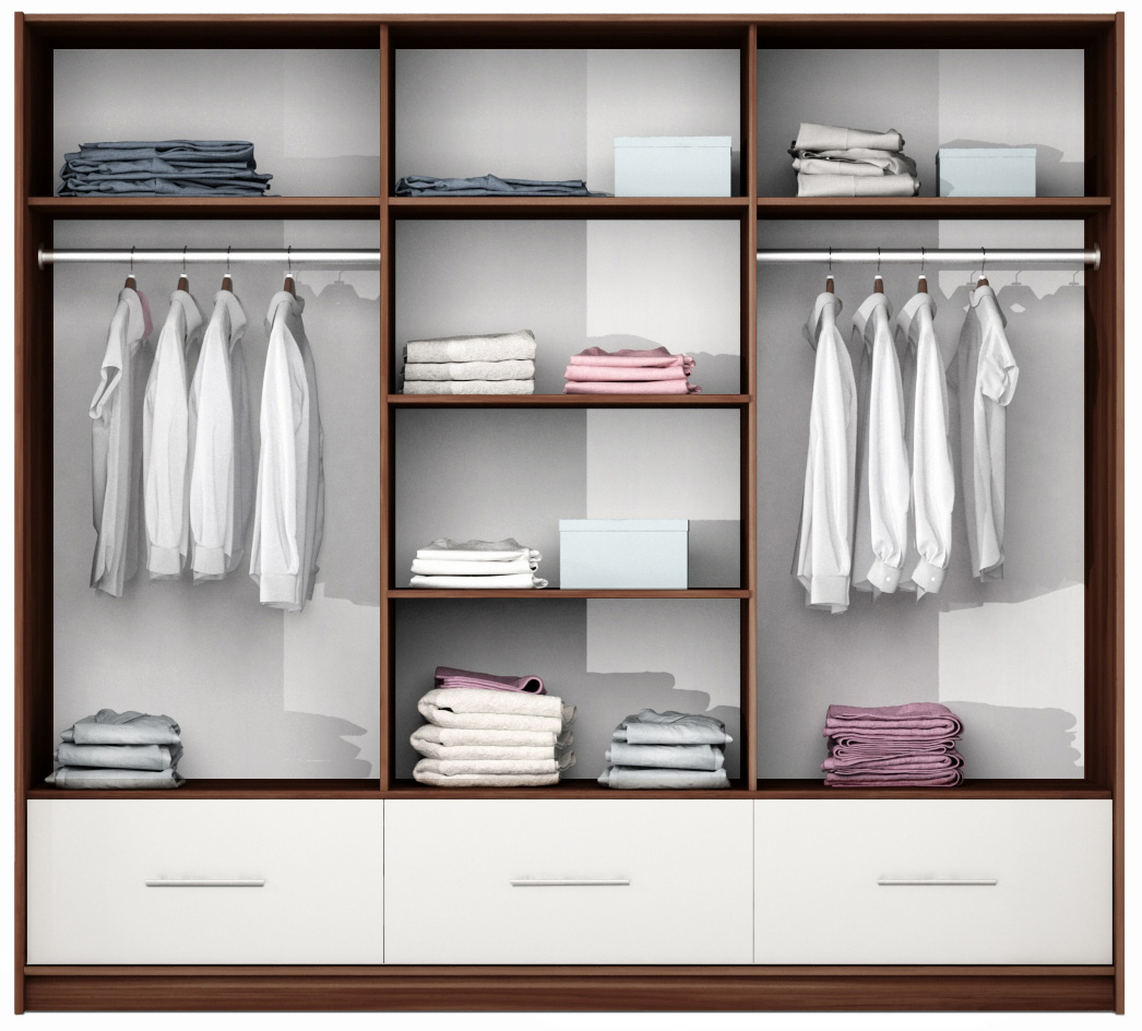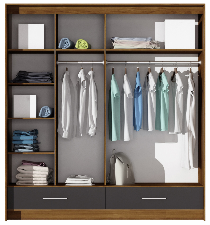 - Šířka 203 cm: Levá strana s několika policemi, prostřední a pravá část se dvěma šatními tyčemi a policemi, dvě zásuvky ve spodní části.