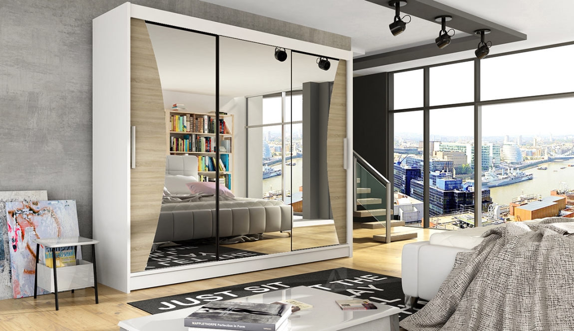 Šatní skříň ANDE IV je ideální volbou pro moderní interiér. Nabízí dostatek úložného prostoru a elegantní design s atypickým zrcadlem.