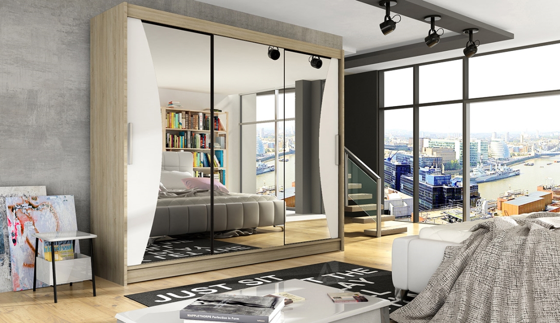 Šatní skříň ANDE IV se vyznačuje zakřiveným zrcadlem, které opticky zvětšuje prostor a dodává mu vzdušnost. Kombinace dubu sonoma a bílého matu se hodí do moderních interiérů a vytváří příjemnou atmosféru. Skříň nabízí dostatek úložného prostoru pro vaše oblečení, obuv a další osobní věci.