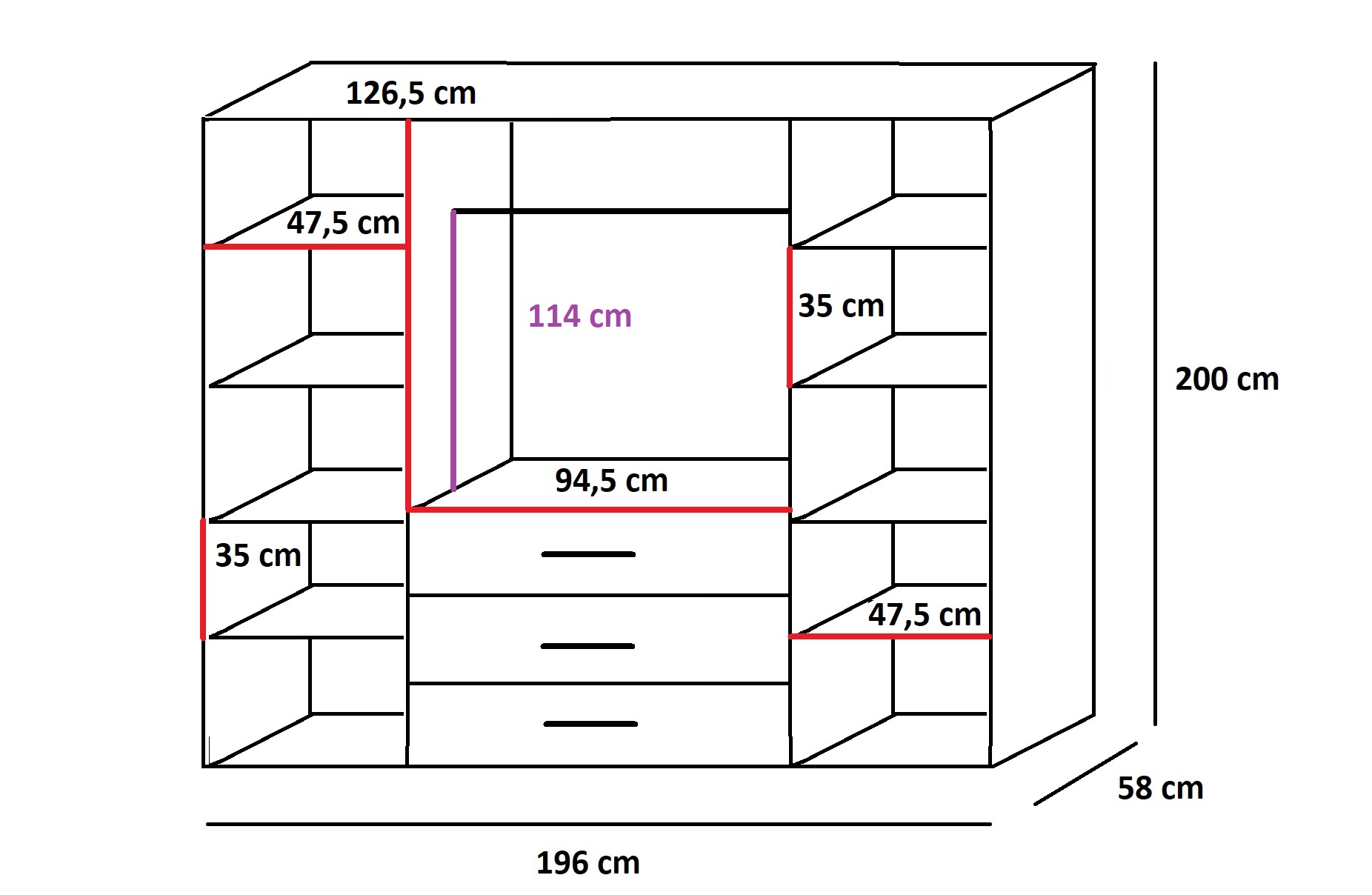 Vnitřní uspořádání skříně je navrženo tak, aby bylo co nejpraktičtější. Po stranách se nachází police a uprostřed šatní tyč, což vám umožní snadno uspořádat oblečení. Ve spodní části jsou tři zásuvky, které jsou ideální pro ukládání šperků, pásků a dalších drobných doplňků.