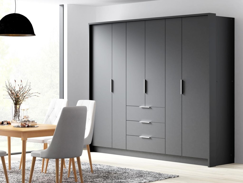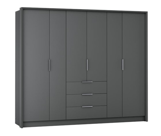 Šatní skříň Bangkok 255 je ideálním řešením pro každého, kdo hledá stylové a funkční úložné prostory. Její moderní design v grafitové barvě skvěle zapadne do různých interiérů a přinese do vašeho domova nádech elegance a minimalismu.