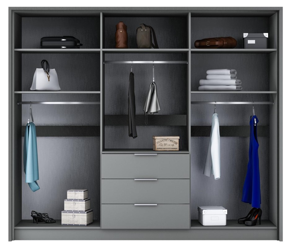 Šatní skříň Bangkok 255 je navržena s důrazem na praktičnost. Její vnitřní uspořádání zahrnuje: