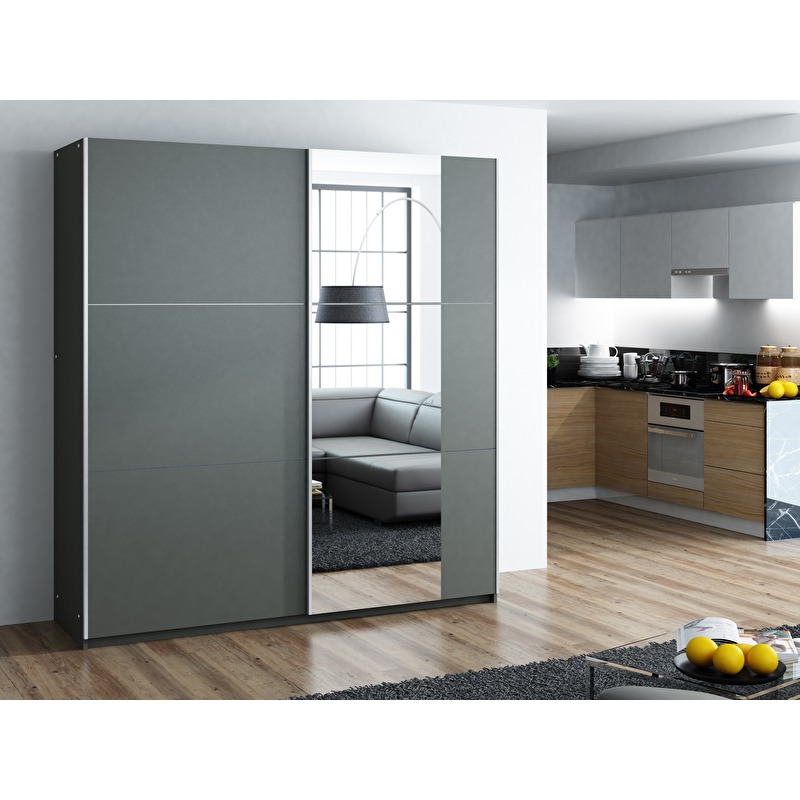 Šatní skříň Bastia v grafitové barvě je ideální volbou pro ty, kteří hledají moderní a funkční řešení pro úložný prostor. S rozměry 250 cm nabízí dostatek místa pro vaše oblečení a doplňky, zatímco elegantní design s nevšedním umístěním zrcadla přidává na atraktivitě.