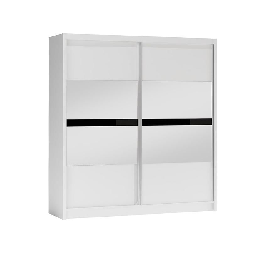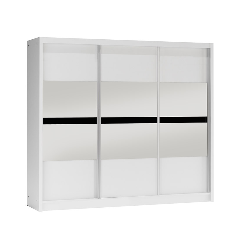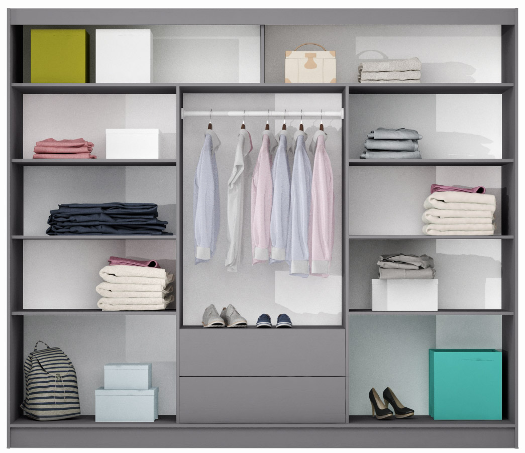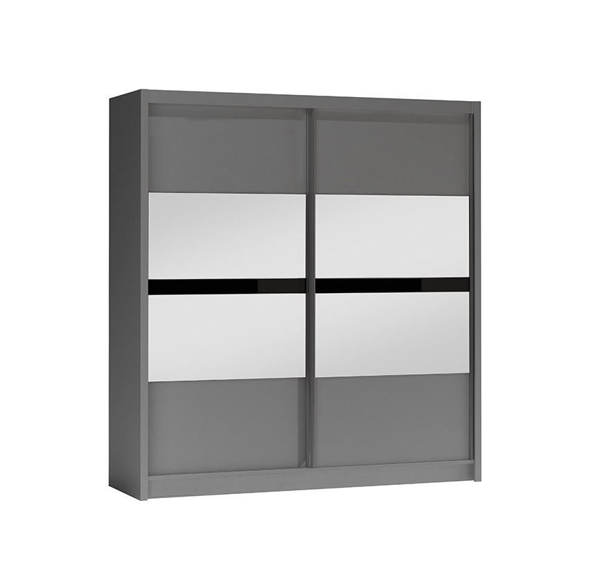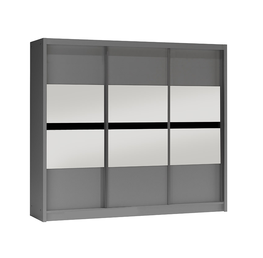 Šatní skříň Batumi je dostupná v elegantní grafitové barvě, ale můžete si ji pořídit také v klasické bílé variantě. Zrcadlo na posuvných dveřích nejenom že opticky zvětšuje prostor, ale také přidává na atraktivitě.