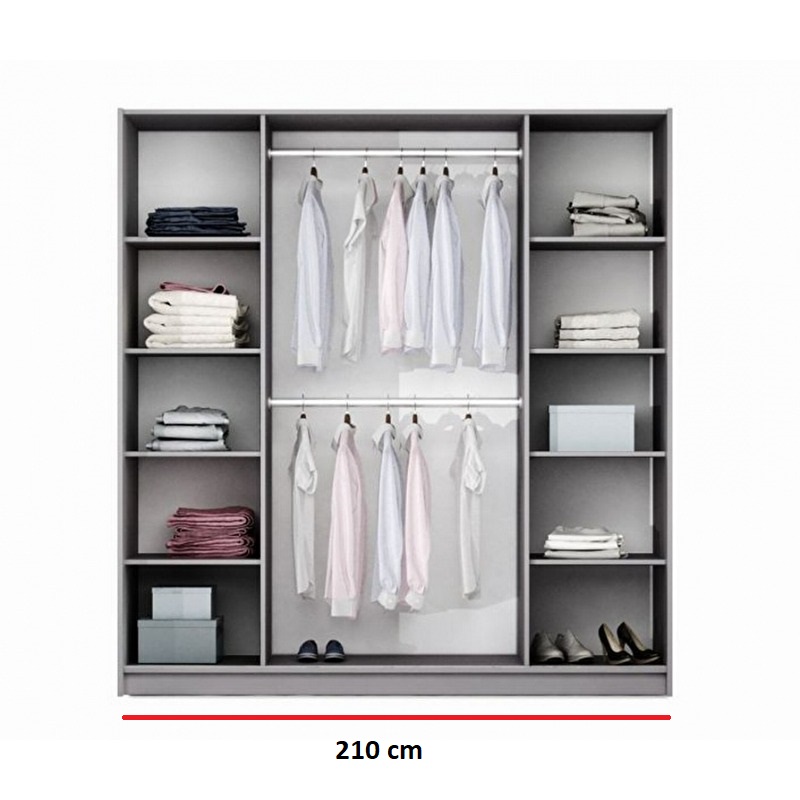 • Šířka 210 cm: Po levé a pravé straně jsou umístěny police, ideální pro uložení doplňků.