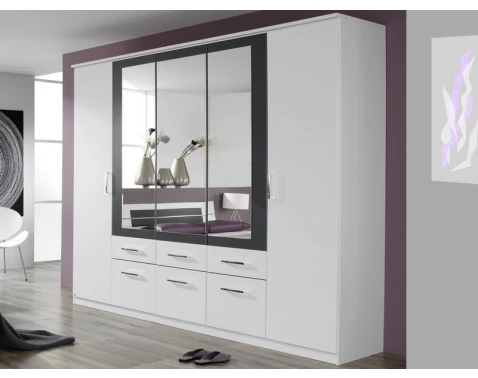 Šatní skříň Burano je ideálním doplňkem pro moderní ložnice. S šířkou 225 cm nabízí dostatek úložného prostoru pro vaše oblečení, obuv a další osobní věci. Její stylový design v kombinaci bílé a tmavě šedé barvy dodá každému interiéru elegantní vzhled.
