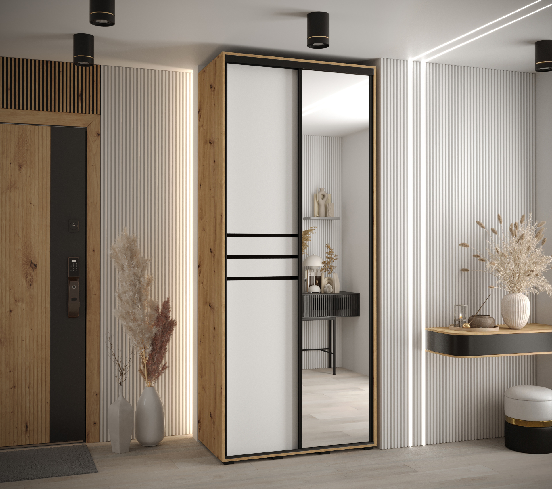 Korpus skříně je v elegantním odstínu Dub Artisan, zatímco dveře jsou v čisté bílé barvě, což vytváří moderní a svěží vzhled. Ozdobné lišty a úchyty jsou dostupné v různých barevných variantách, avšak zlaté lišty nelze kombinovat s Dubem Artisan.