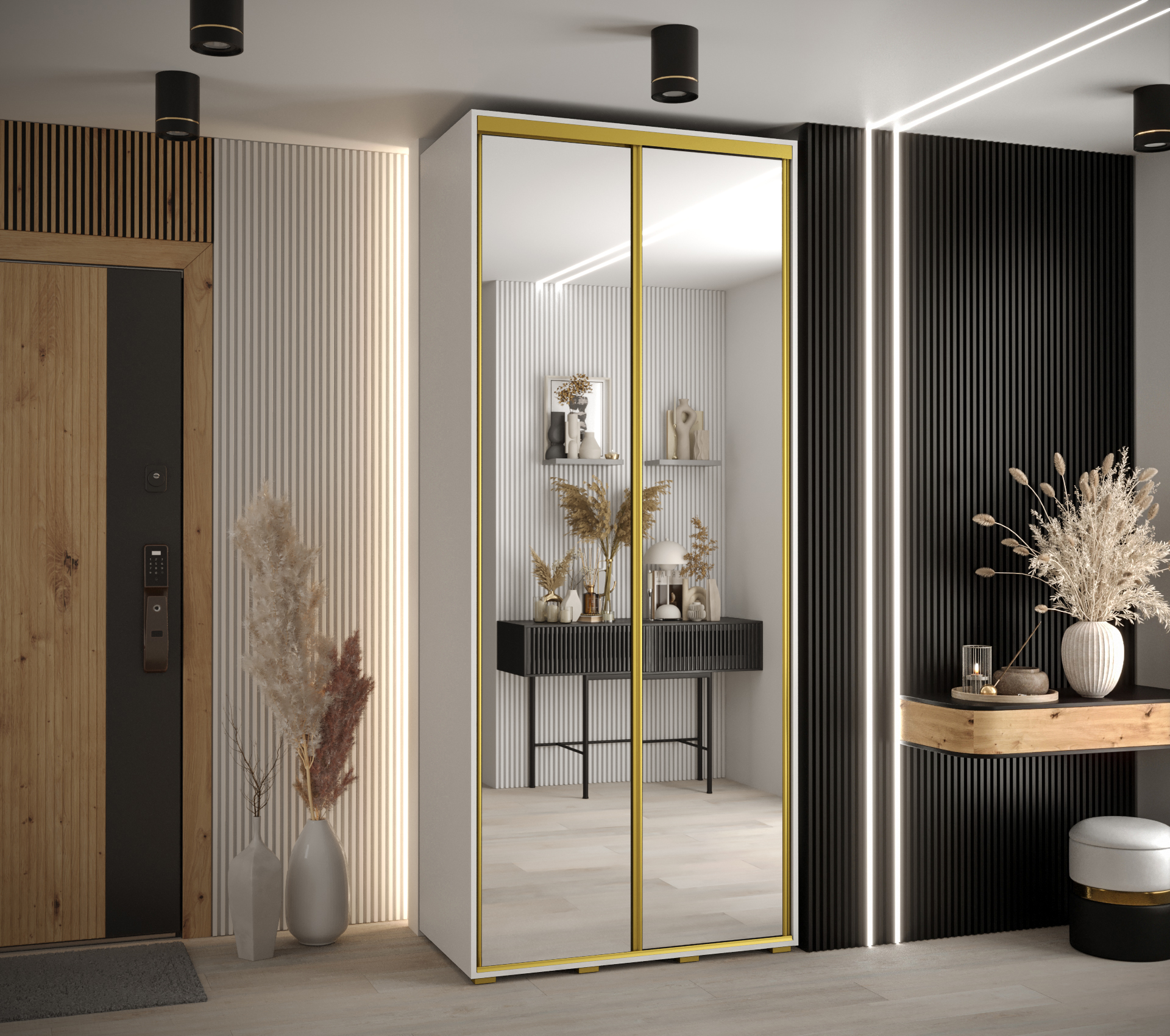 Skříň obsahuje minimálně dvě výsuvné tyče a několik polic, které umožňují variabilní uspořádání podle vašich potřeb. Můžete si je poskládat do doporučených sestav nebo vytvořit vlastní uspořádání pro maximální efektivitu.