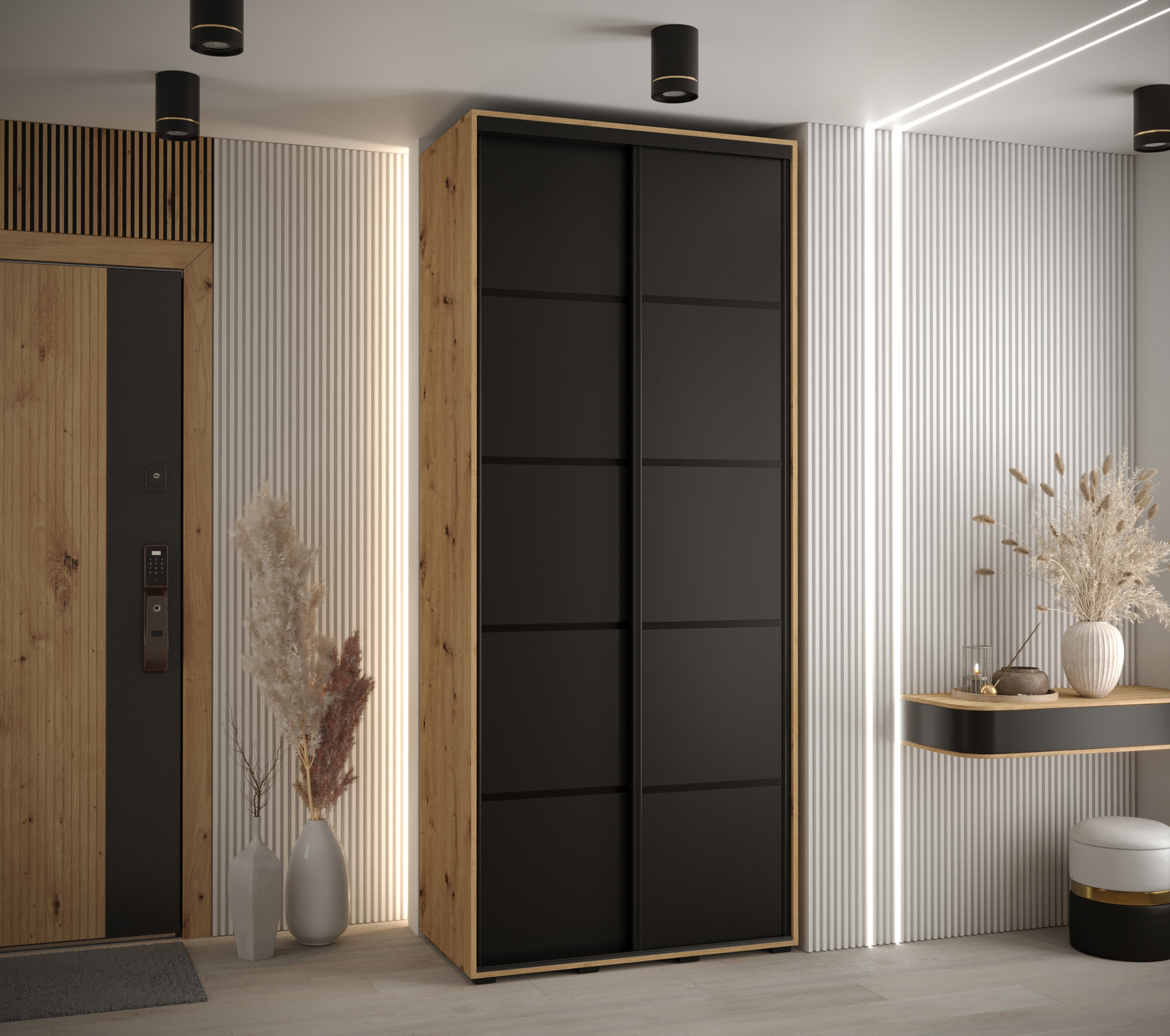 V základní variantě šatní skříň obsahuje minimálně dvě výsuvné tyče a několik polic, které můžete uspořádat podle svých potřeb. Tato variabilita umožňuje maximálně efektivní využití úložného prostoru.