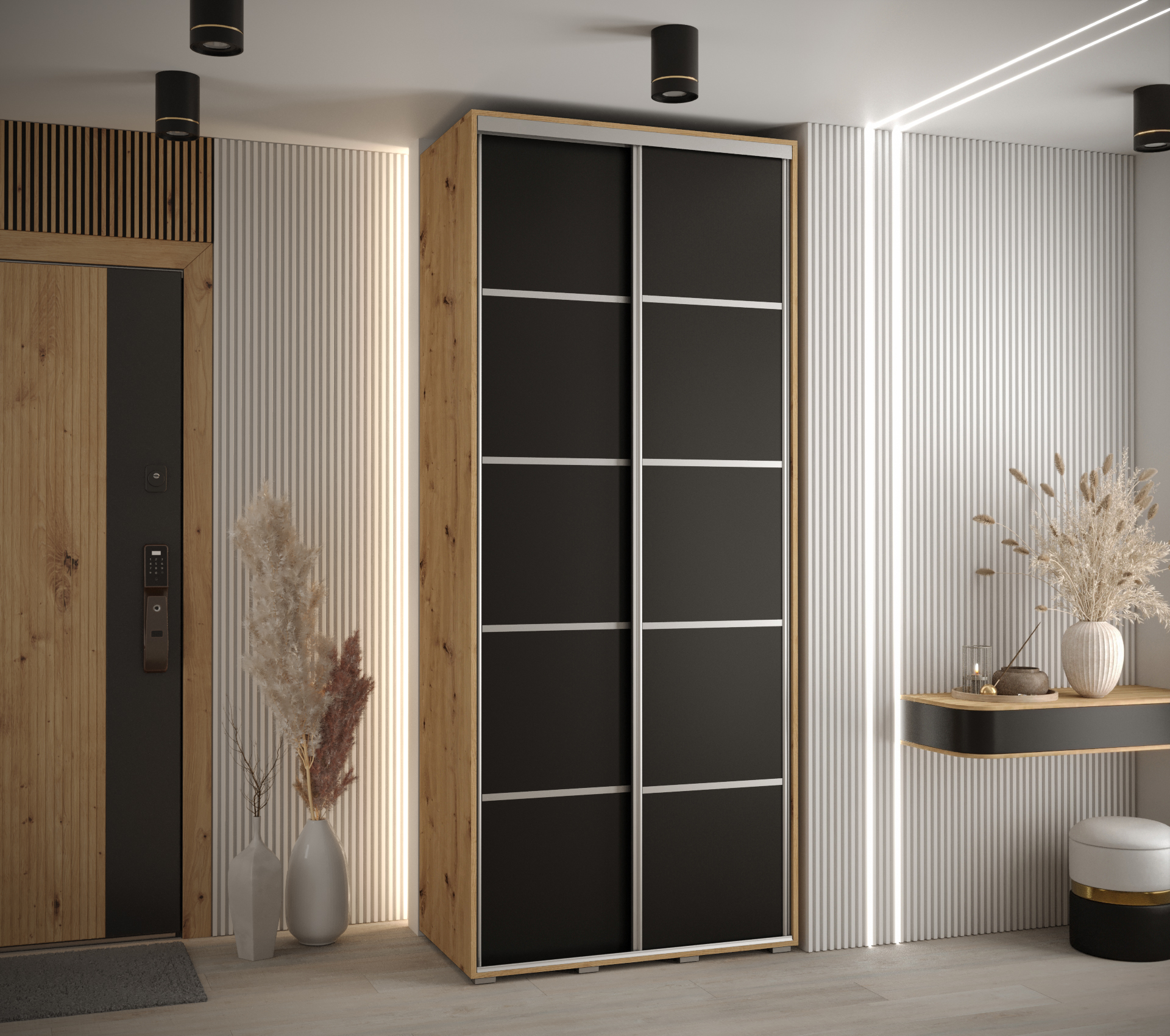 Šatní skříň je dostupná v různých barevných variantách. Korpus a dveře mohou být v barvě bílá, černá nebo Dub – Artisan, což umožňuje snadnou kombinaci s ostatním nábytkem ve vaší domácnosti.