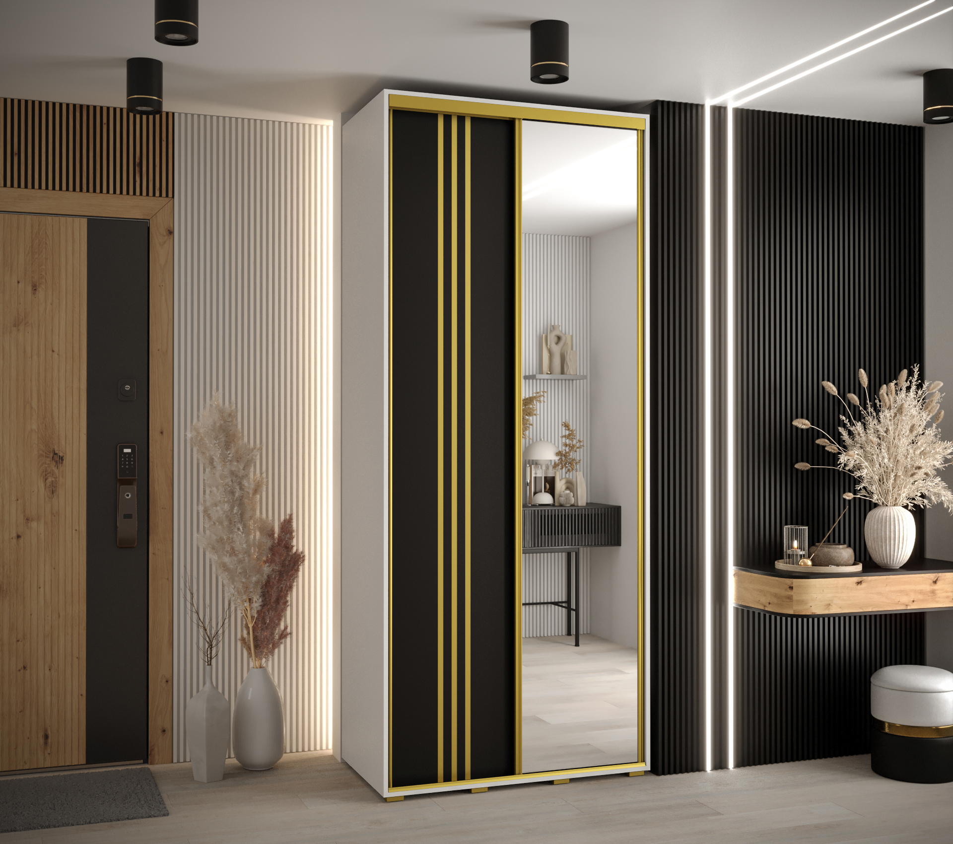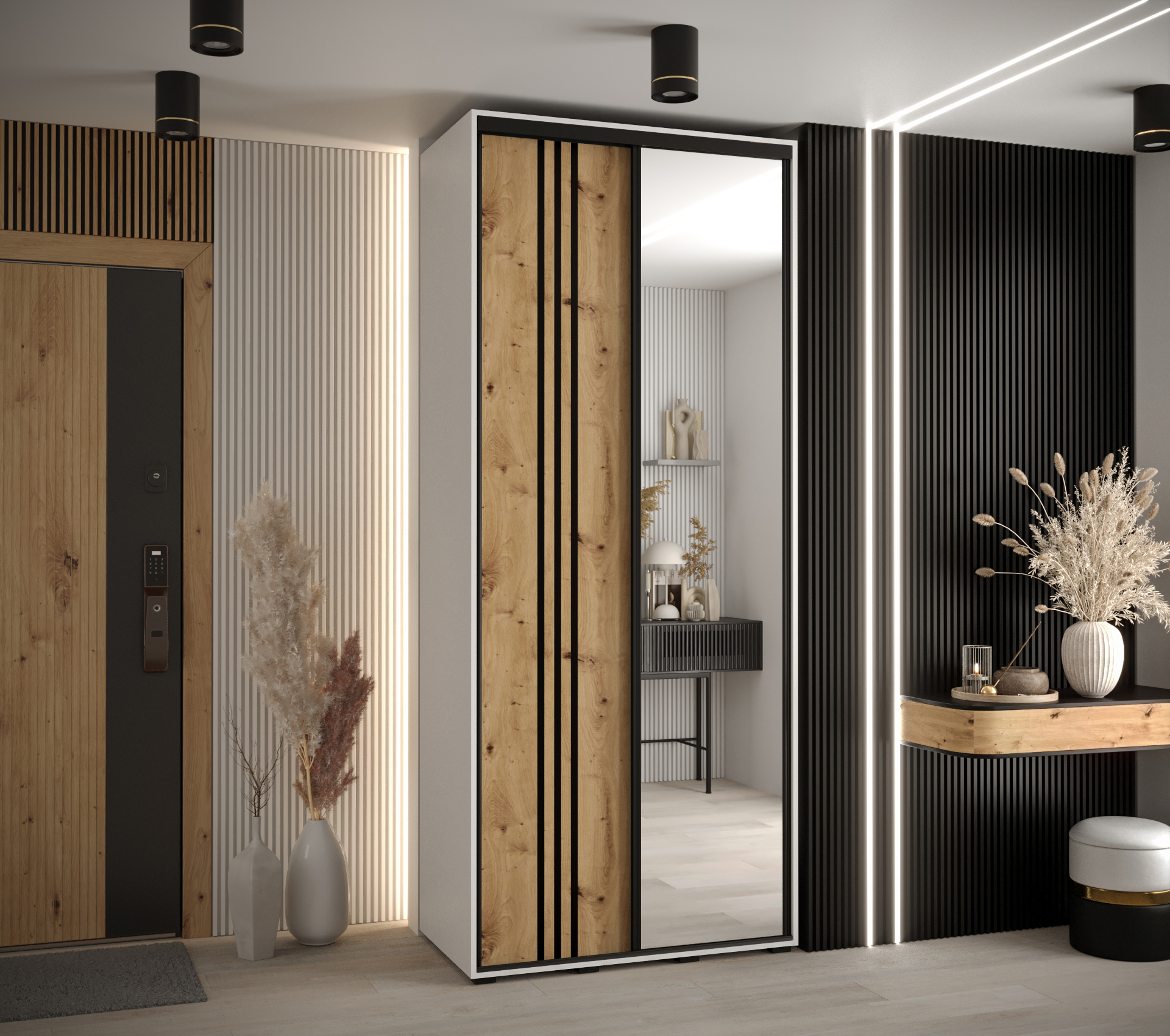 Šatní skříň je k dispozici v několika barevných variantách, včetně černého korpusu a dubových dveří. Ozdobné lišty a úchyty jsou také dostupné v různých barvách, což umožňuje přizpůsobení skříně vašemu stylu.